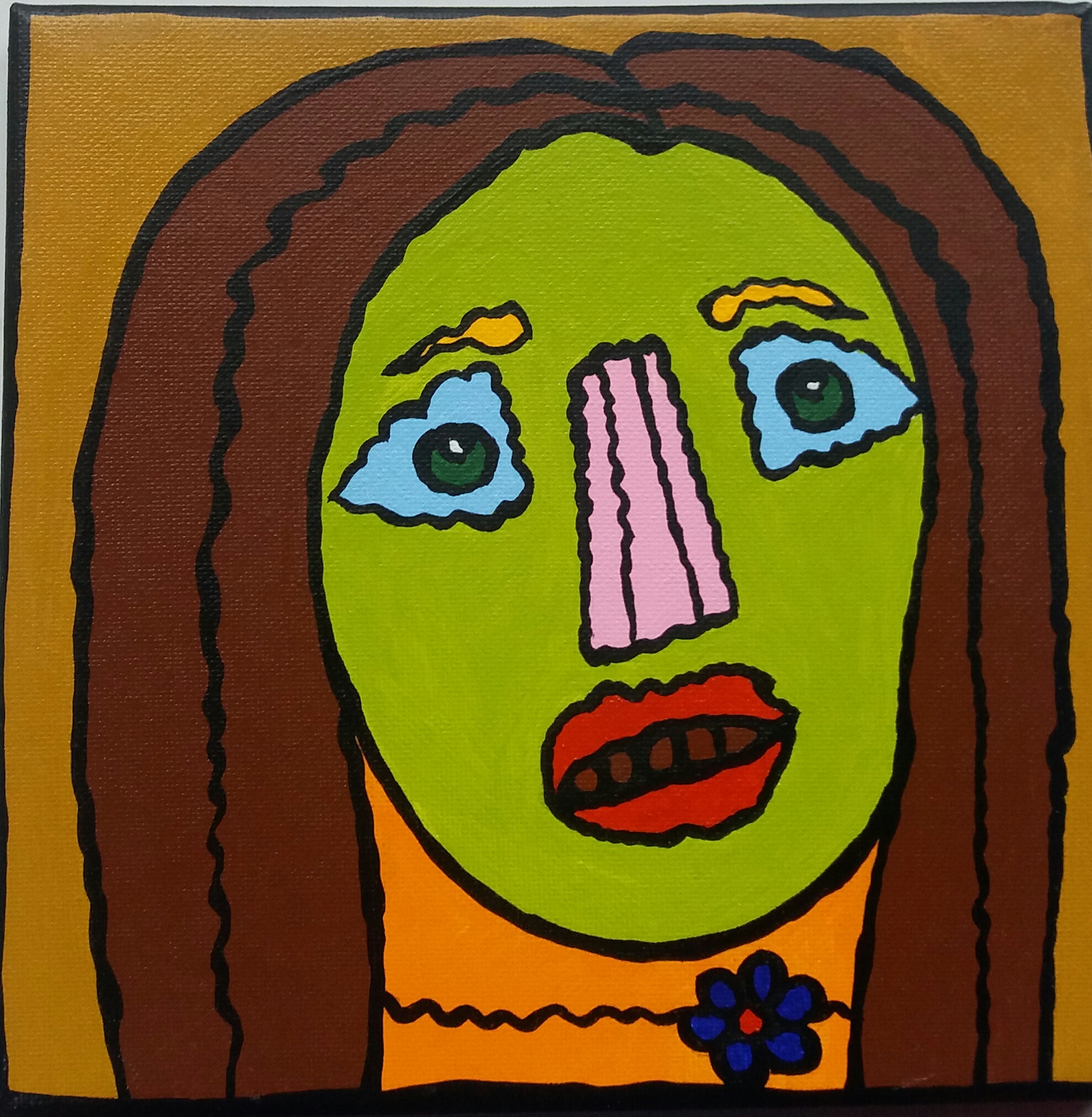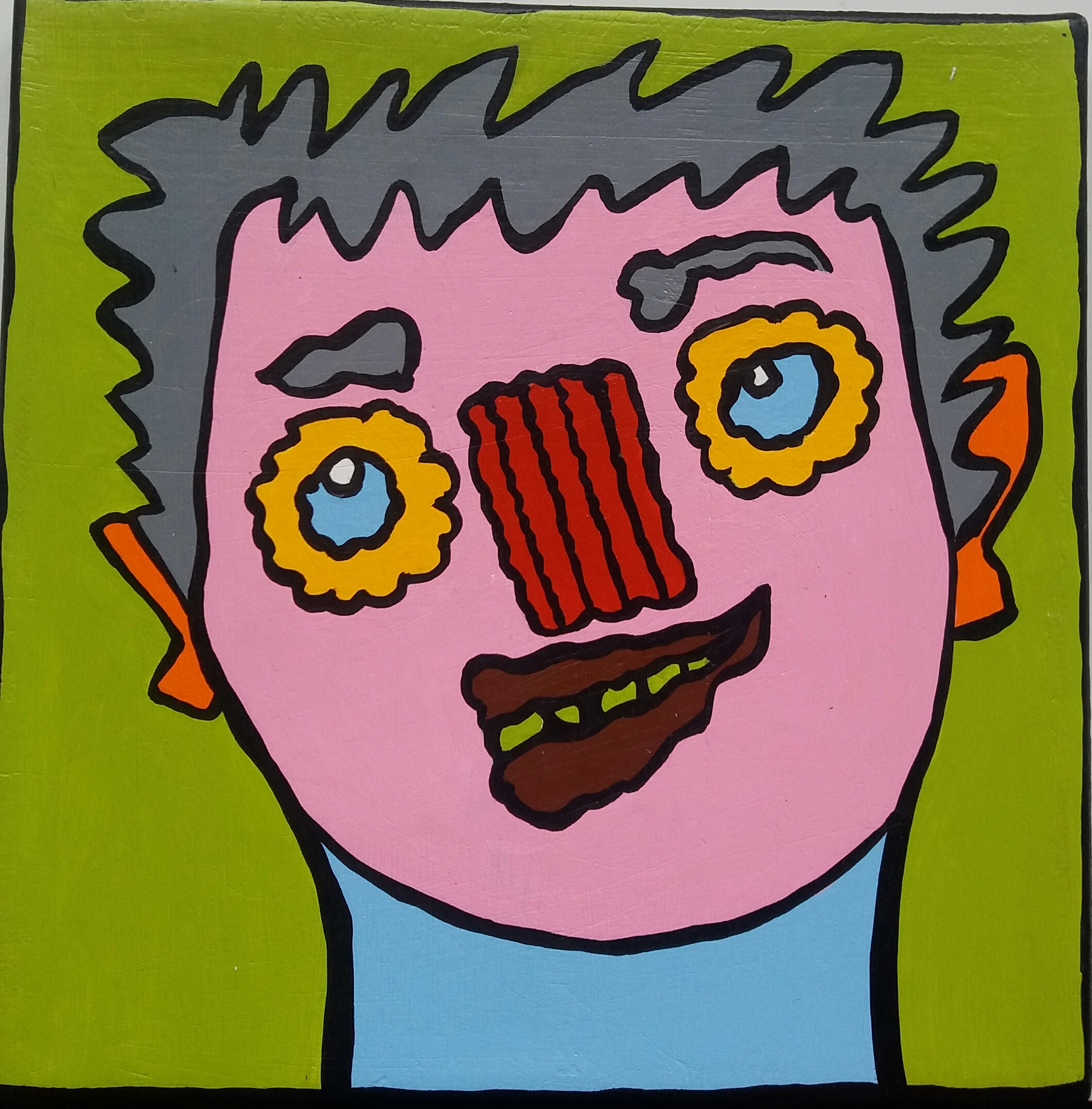 Muovendo da una riflessione sul rapporto tra rete, immagine e le forme del sé, le facce di Faccebook rispondono a un preciso linguaggio decodificativo. La serie dei 100 si caratterizza per una ripetizione di stilemi: il contorno preciso e lineare, l’utilizzo di colori primari e derivati sgargianti e netti, il fondo monocromo in stile “foto-tessera”.