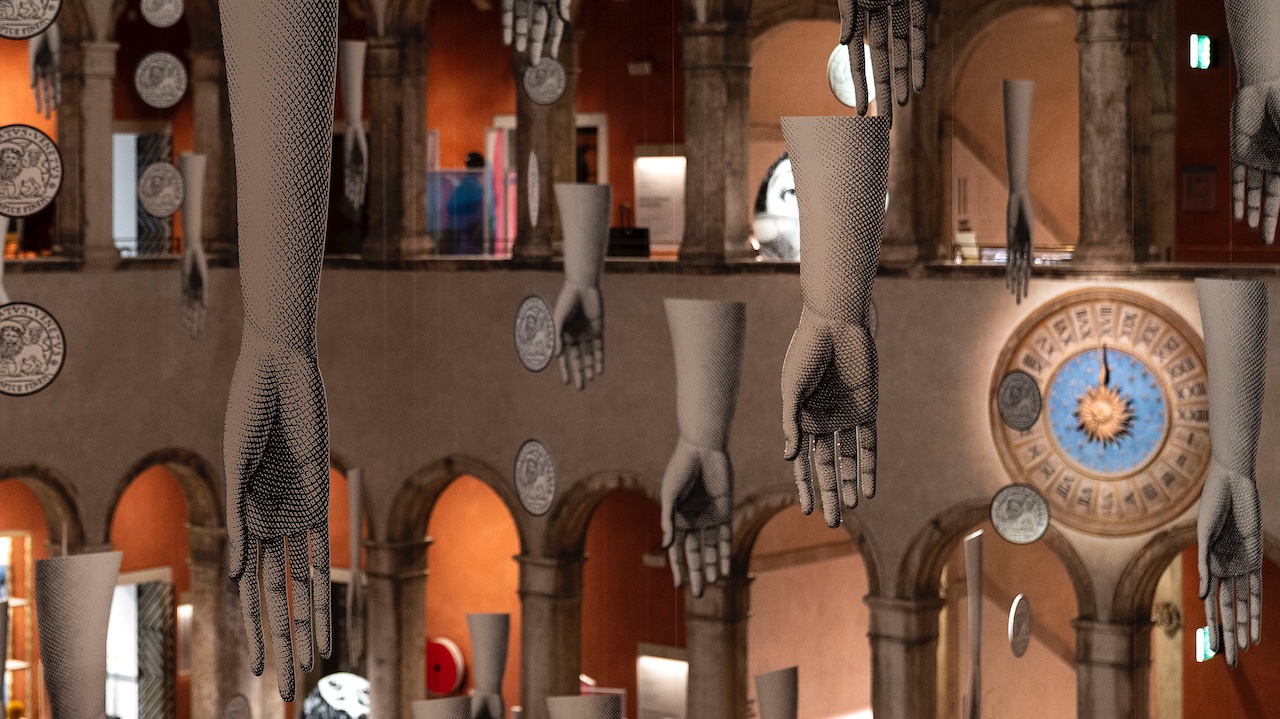 Sagome di braccia e mani, che ora schiaffeggiano, ora accarezzano l’aria, lasciano cadere degli antichi ducati su cui è impresso un invito ad agire con prudenza – “Respice finem” (considera la fine), originariamente inciso su una porta dell’ufficio dei Visdomini che amministravano il Fondaco per conto della Serenissima.