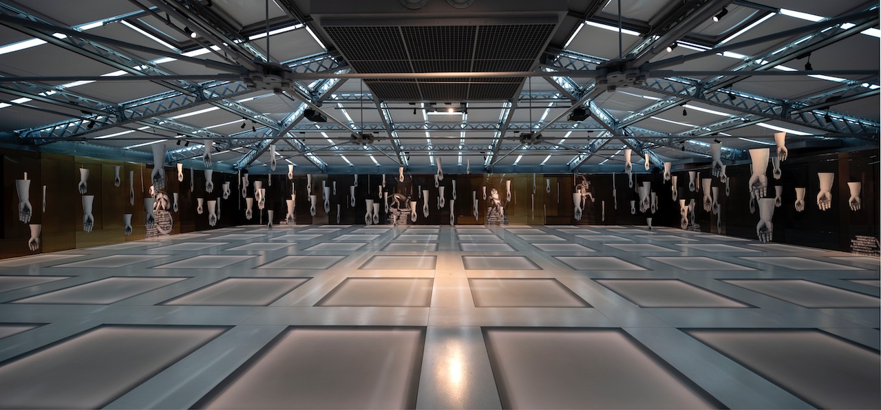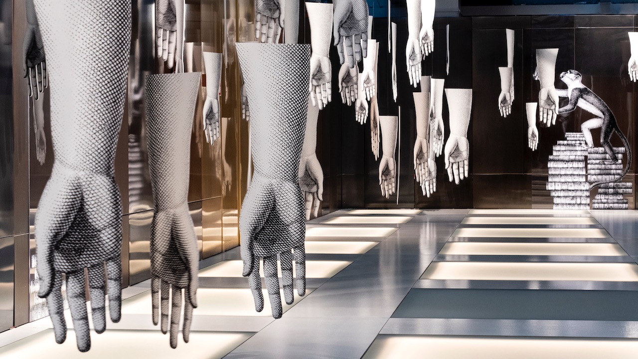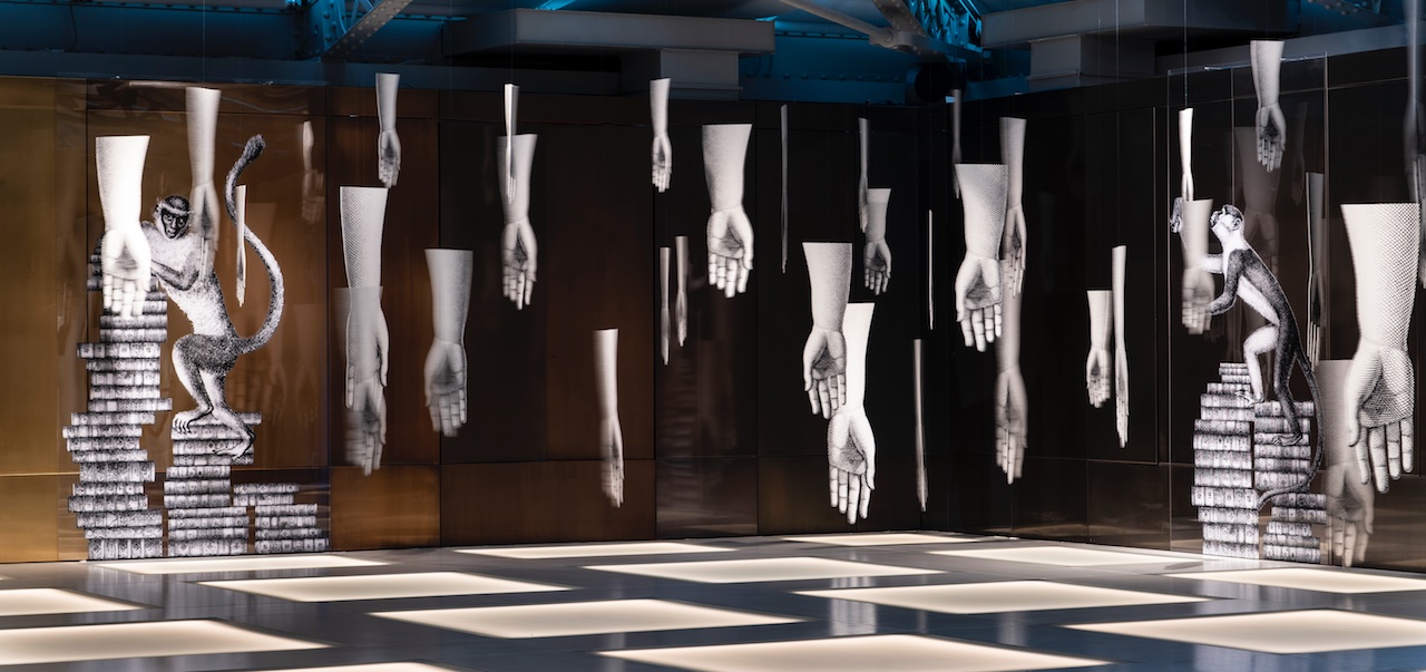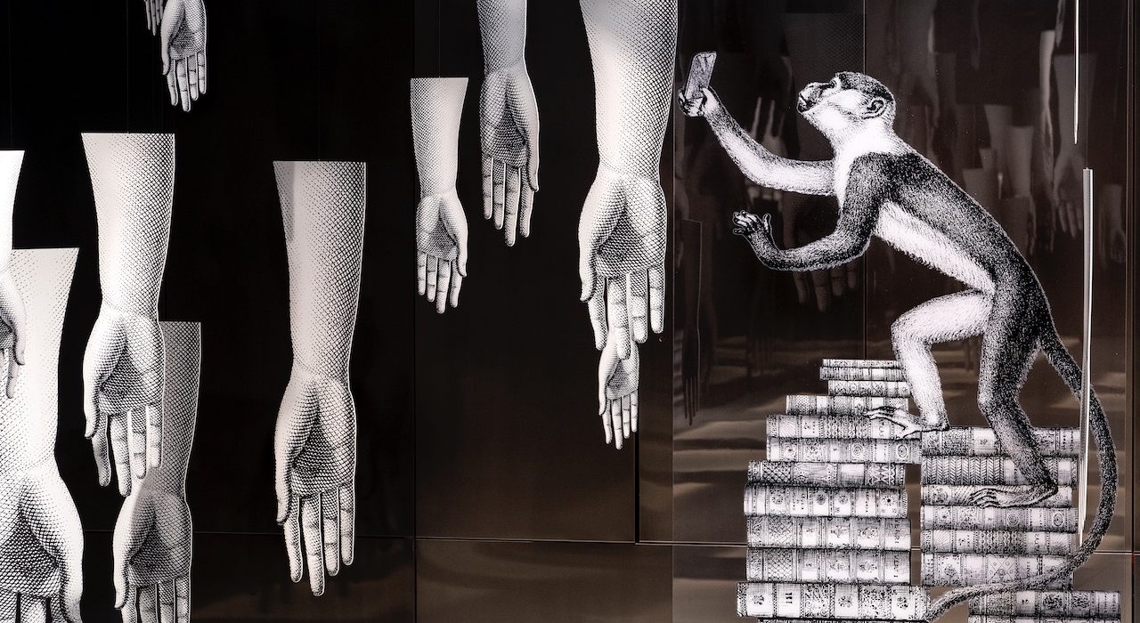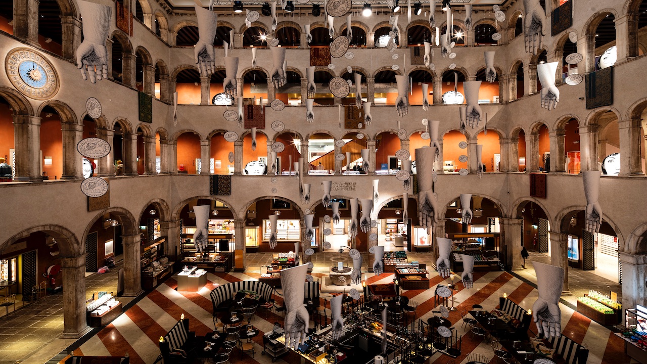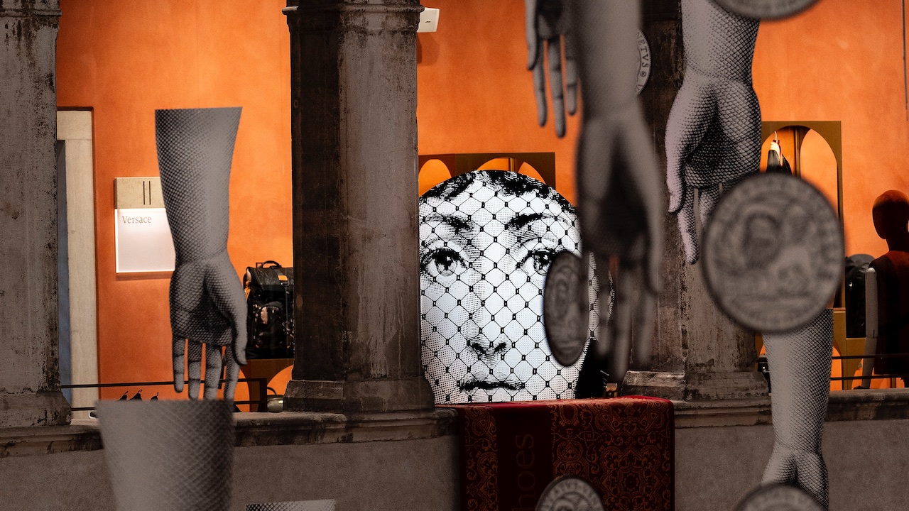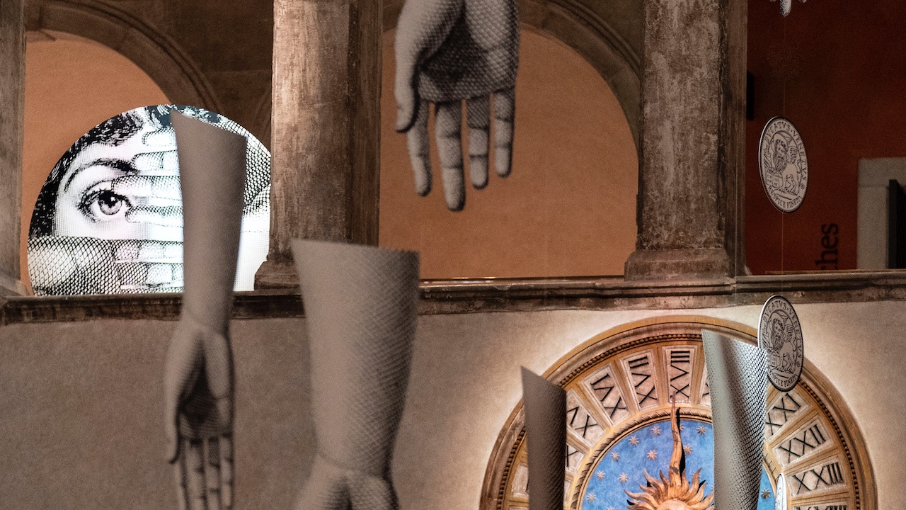 Un intervento artistico site-specific che permea tutta la sede del Fondaco dal quarto piano, alla corte fino alla porta d’acqua. Tra volti femminili, scimmie irriverenti e mani che fendono l’aria, l’installazione, firmata da Barnaba Fornasetti e Valeria Manzi, dialoga con gli spazi e con la portata simbolica del luogo che la ospita, giocando con i suoi segni storici.