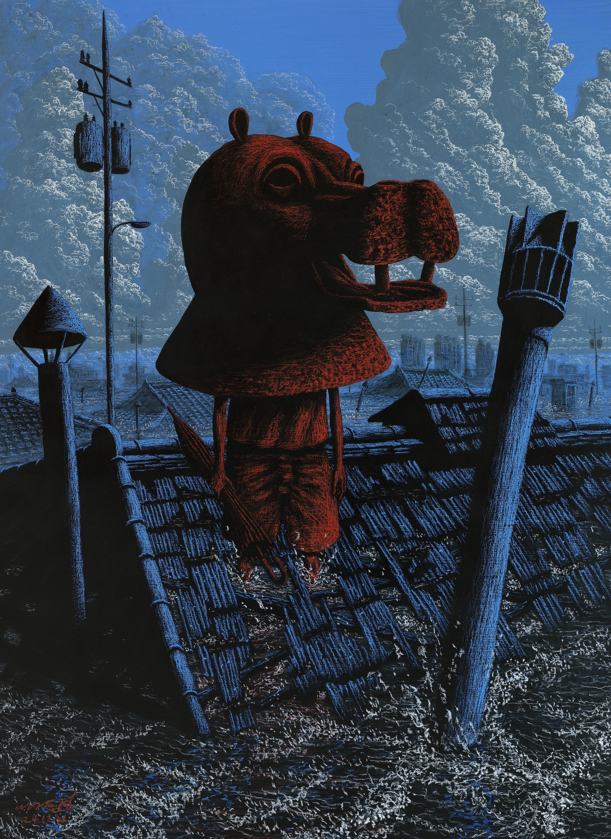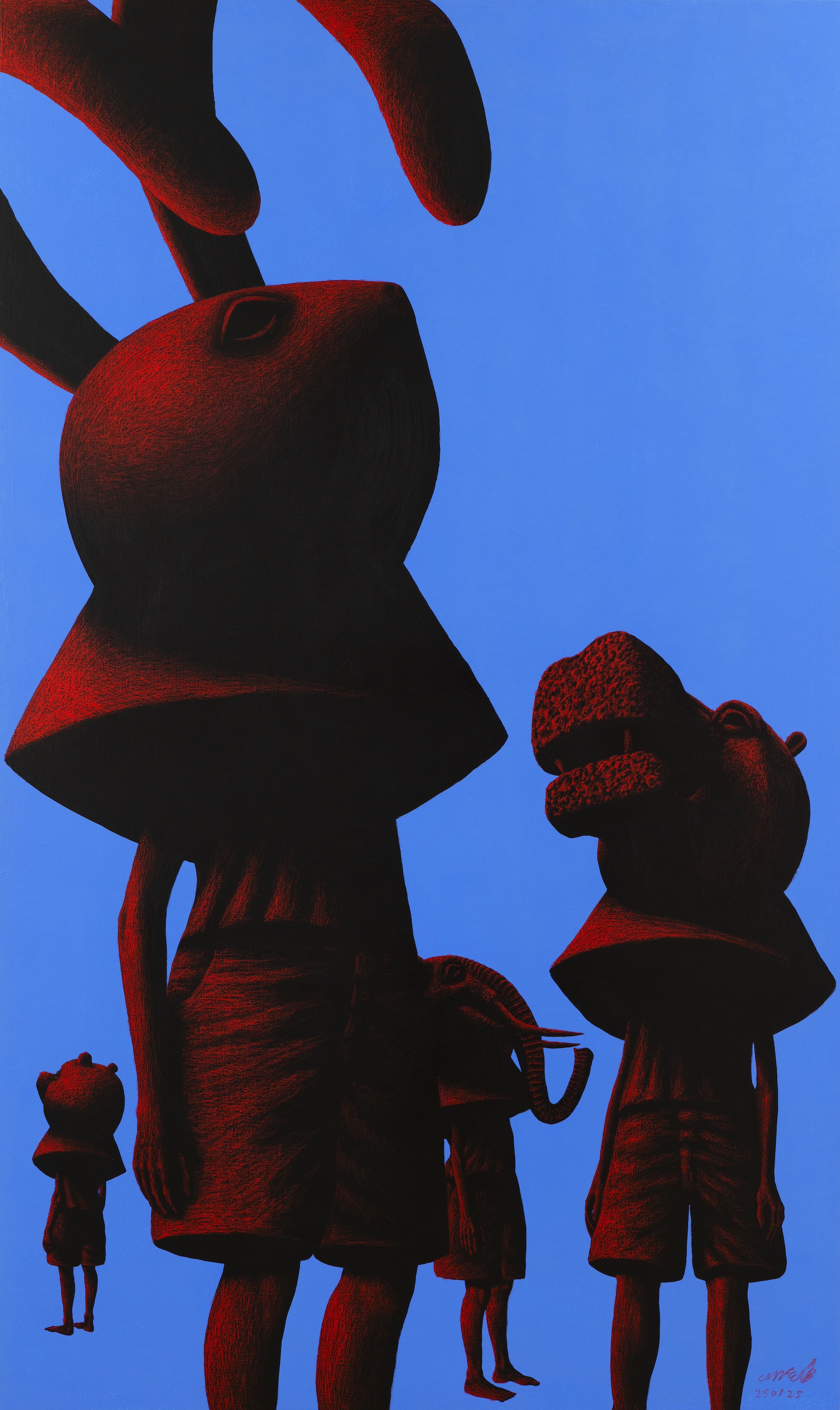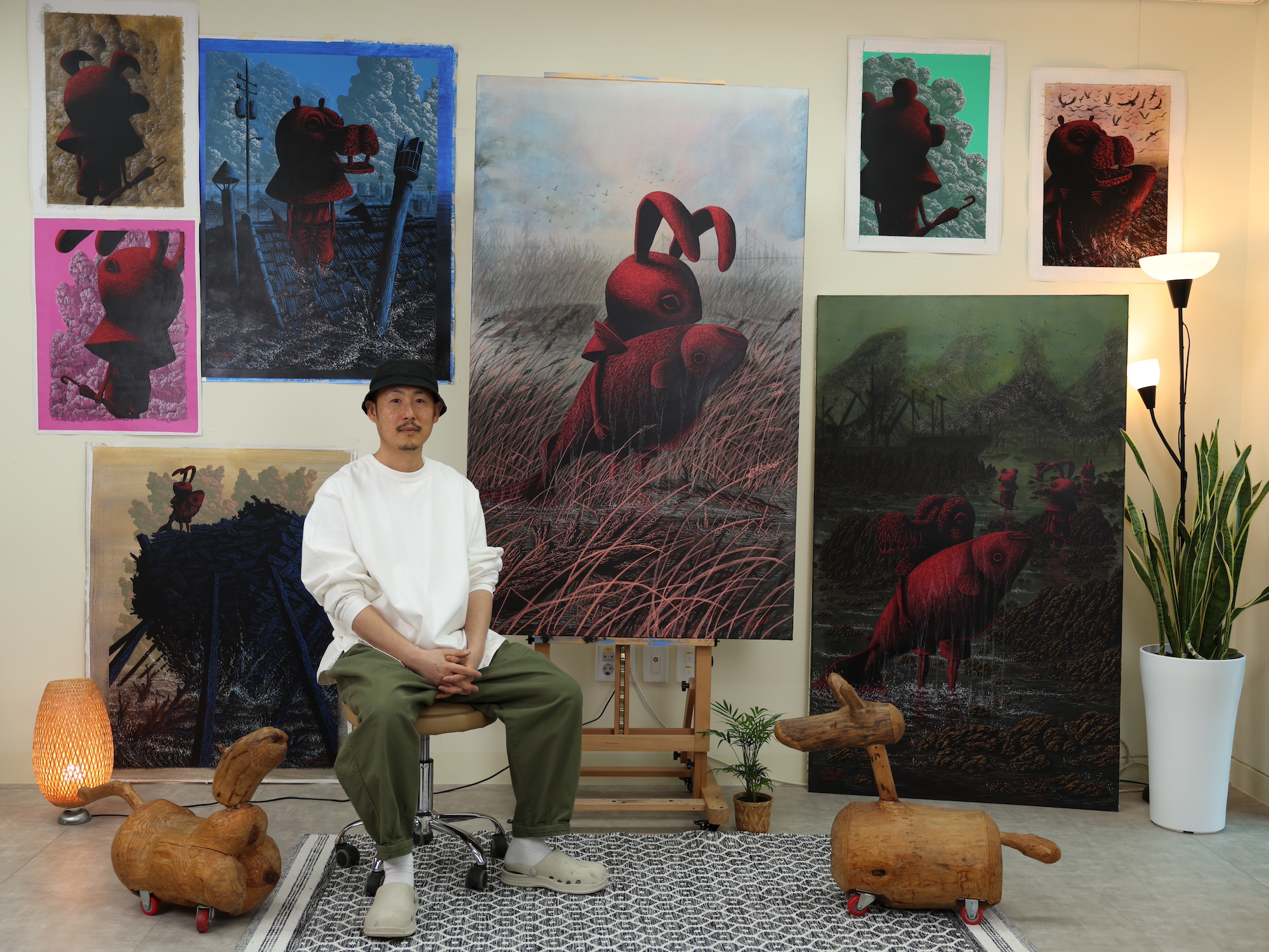 Cresciuto in un villaggio rurale dove convivono industria e tradizione, Lee porta questa dualità nel suo linguaggio visivo. Le figure che abitano le sue tele sono volutamente indefinite (non del tutto umane, né animali, né adulti o bambini) e diventano così simboli universali della memoria, dell’osservazione e di una resilienza silenziosa.
