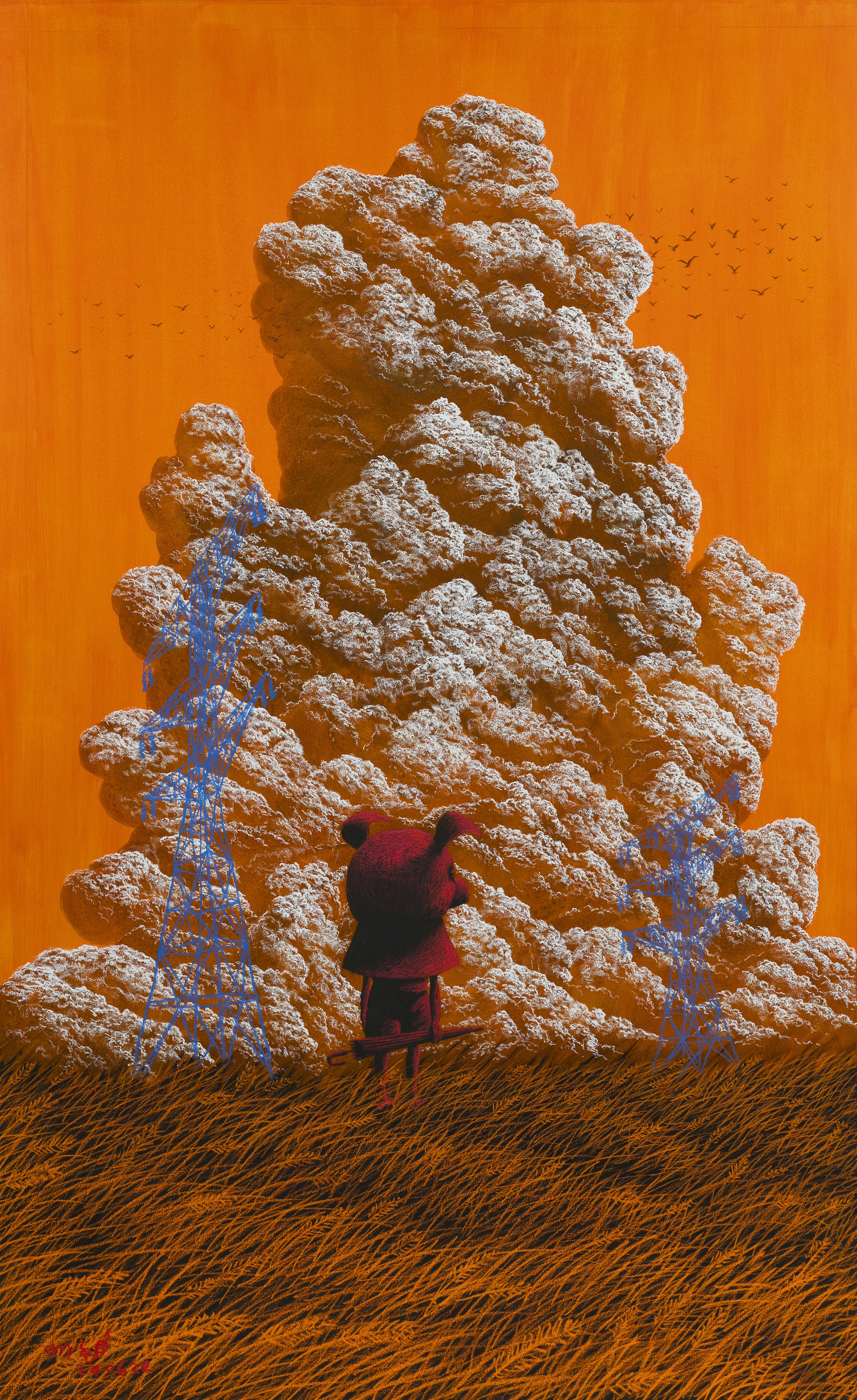 Nato nel 1980 in Corea del Sud, Gihun Lee dipinge con un’intensità silenziosa, dando vita a mondi stratificati in cui figure mascherate si presentano come custodi di storie dimenticate. I suoi lavori, ambientati in paesaggi ricchi di texture (campi, nuvole, e strutture enigmatiche sospese tra il naturale e l’artificiale) non offrono risposte, ma aprono uno spazio per la contemplazione.
