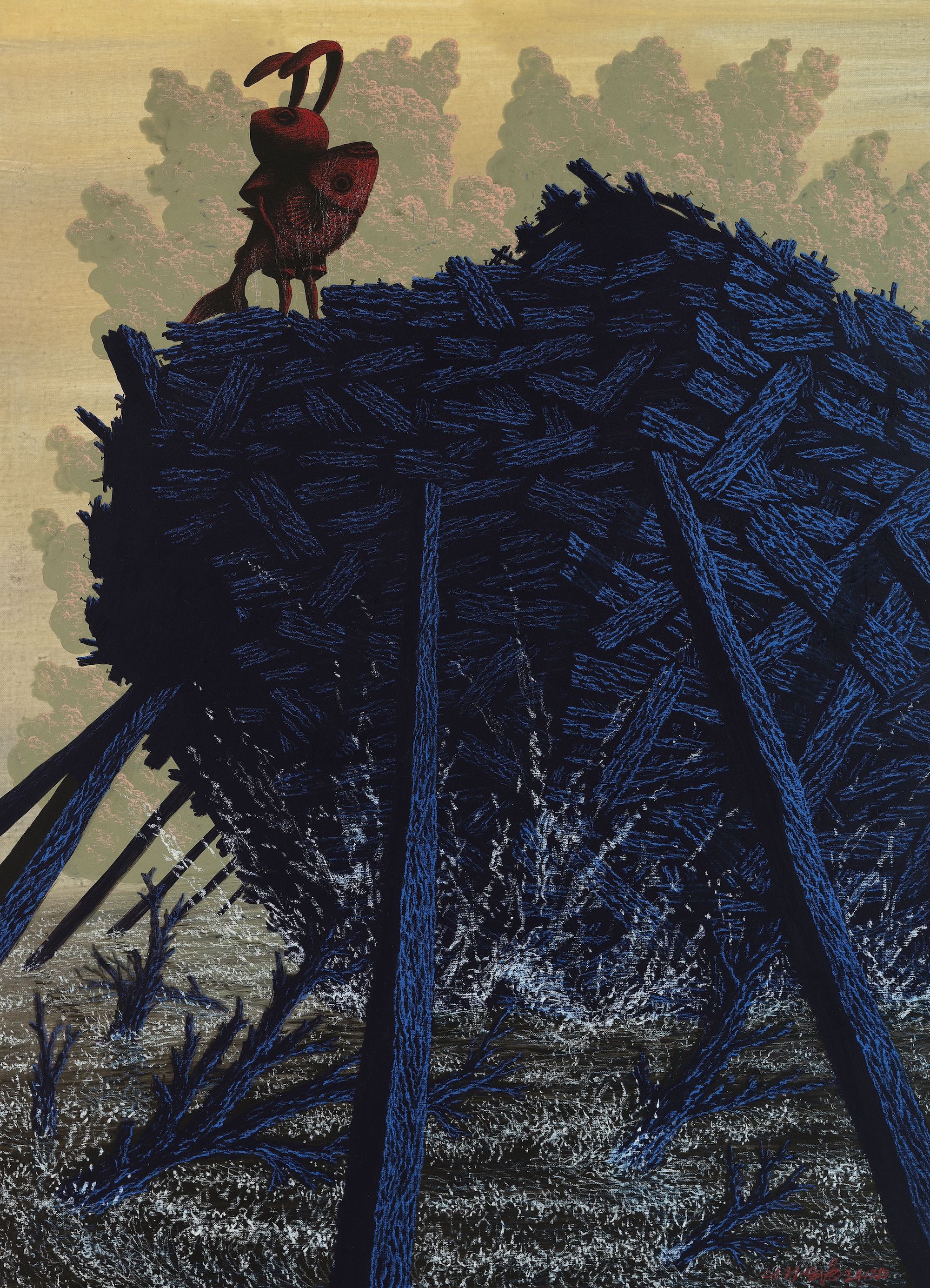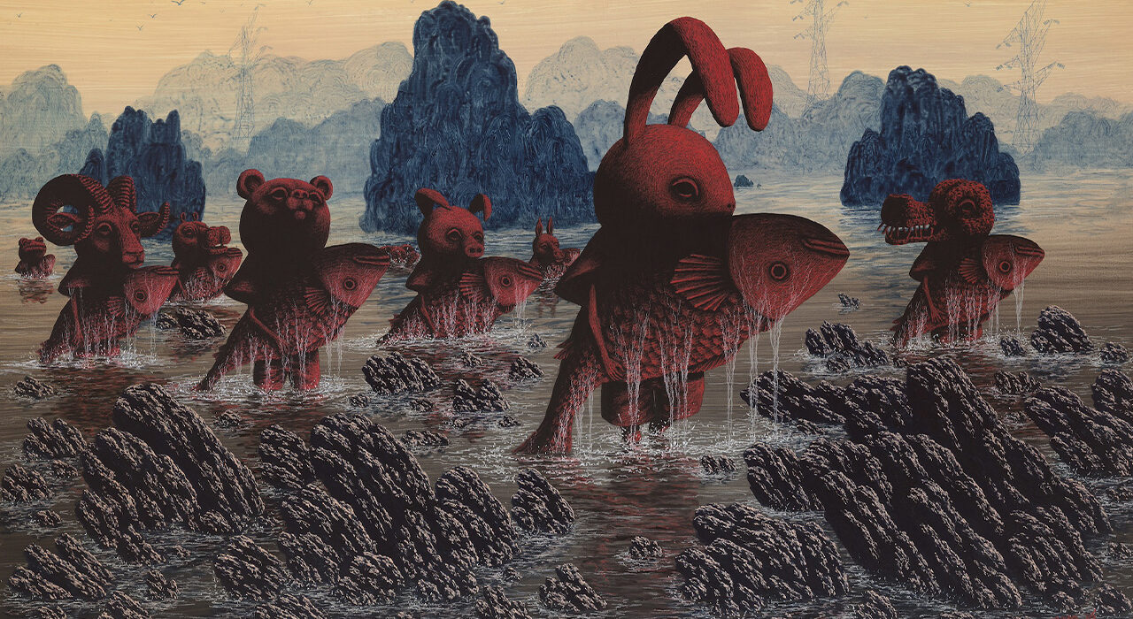 Nato nel 1980 in Corea del Sud, Gihun Lee dipinge con un’intensità silenziosa, dando vita a mondi stratificati in cui figure mascherate si presentano come custodi di storie dimenticate. I suoi lavori, ambientati in paesaggi ricchi di texture (campi, nuvole, e strutture enigmatiche sospese tra il naturale e l’artificiale) non offrono risposte, ma aprono uno spazio per la contemplazione.
