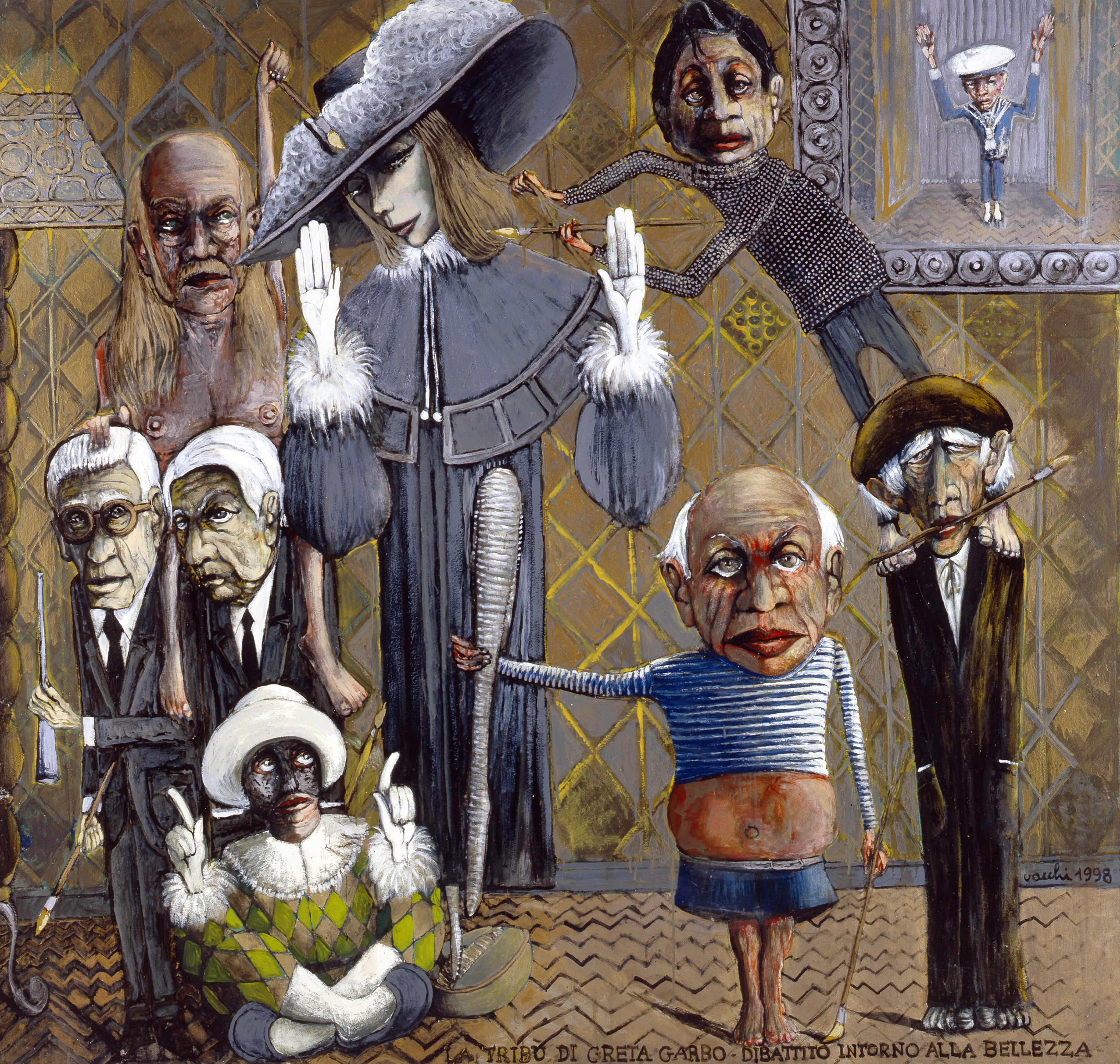 Sergio Vacchi, La tribù di Greta Garbo. Dibattito intorno alla bellezza (1998). Smalto su tela, cm 218 x 200, collezione privata