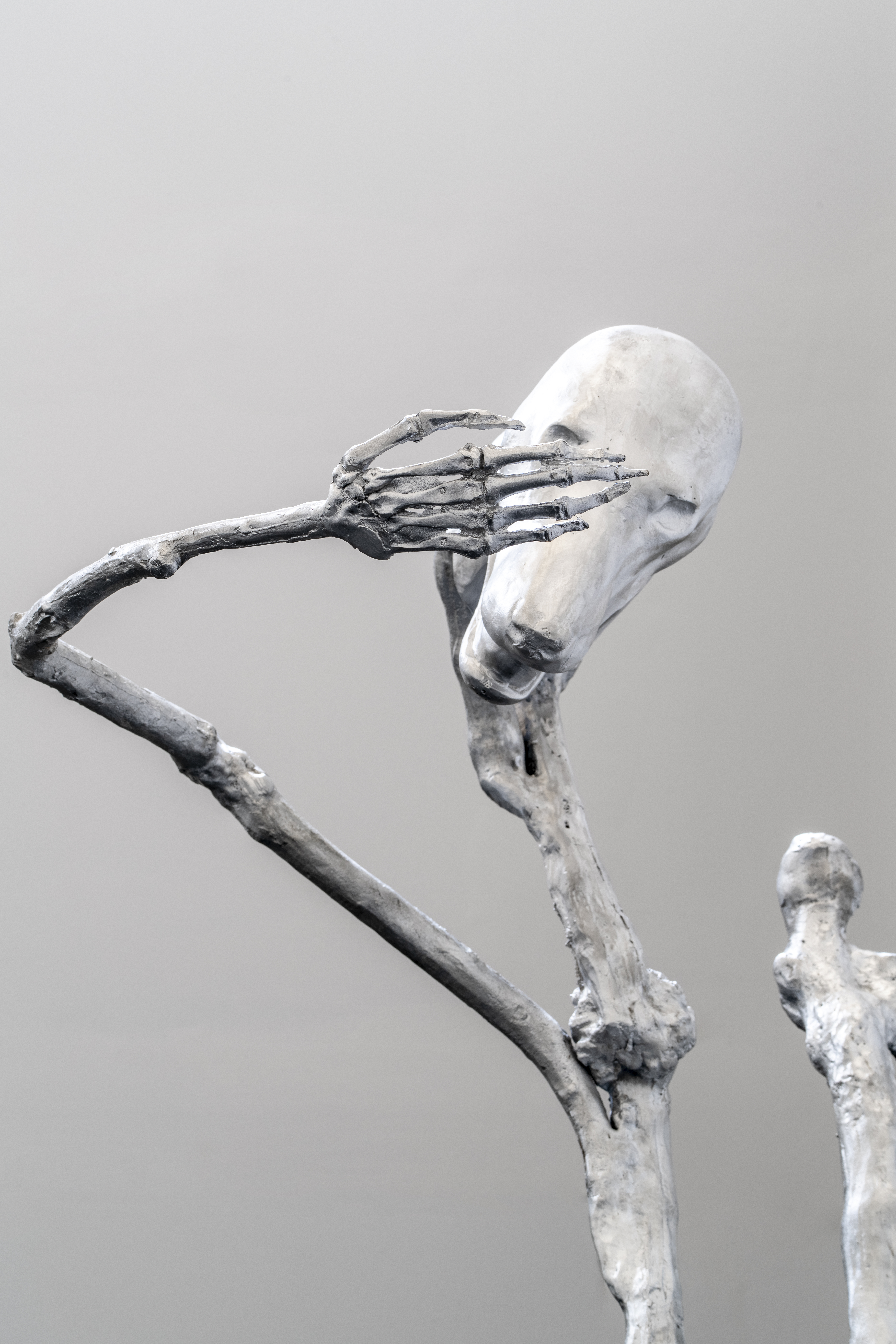 Al centro della sala principale si impone una scultura, costituita da una serie di coclee – o viti di Archimede – collegate tra loro in un assemblaggio continuo attorno alla quale si dispone una costellazione di figure in alluminio caratterizzate da enigmatici sorrisi e segnata da un forte senso di isolamento individuale. Corpi che richiamano anatomie umane, animali e vegetali, saldati insieme in un fragile equilibrio. Nella sala adiacente, una figura a tre teste appare come bloccata in una posa precaria. Chiude il percorso una sala dedicata a una serie di disegni, che restituiscono una dimensione più intima della ricerca formale dell’artista.