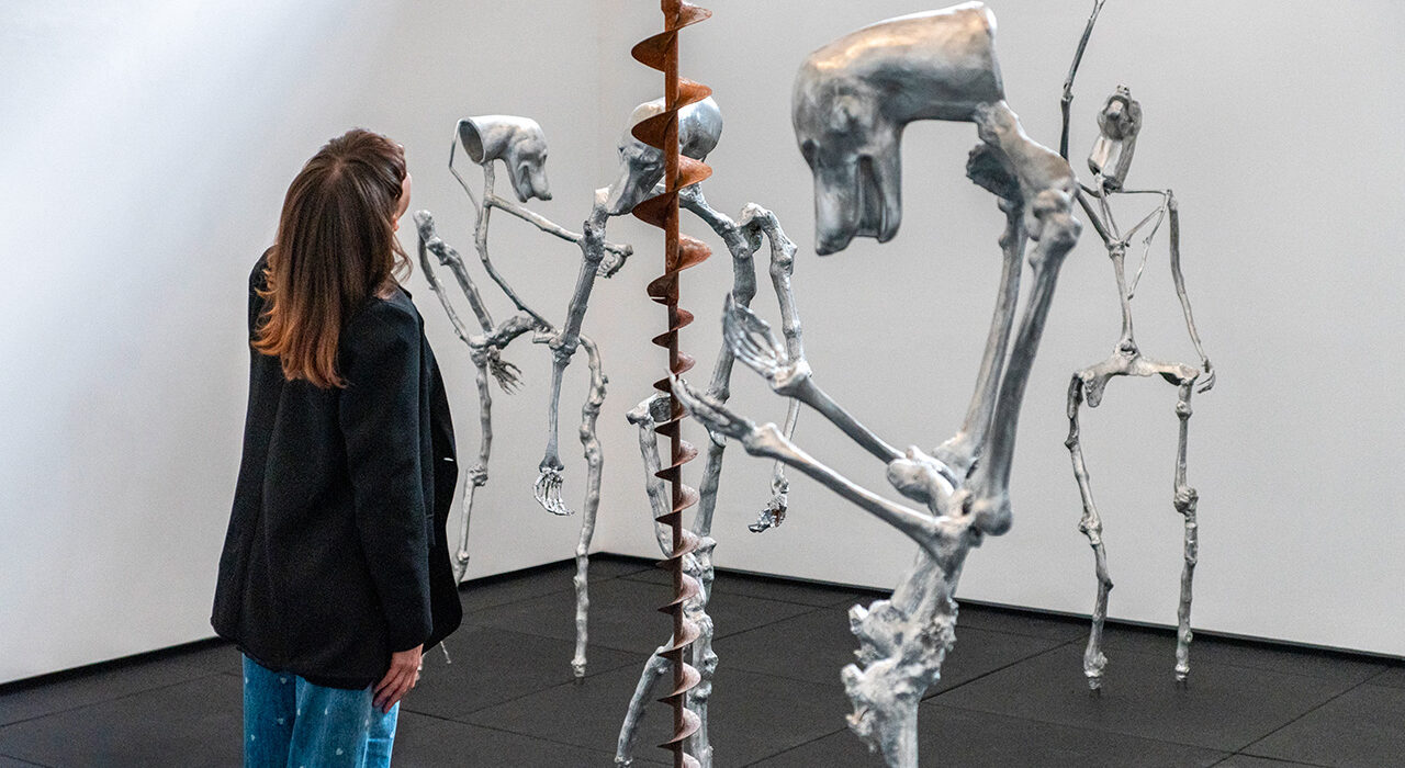 Al centro della sala principale si impone una scultura, costituita da una serie di coclee – o viti di Archimede – collegate tra loro in un assemblaggio continuo attorno alla quale si dispone una costellazione di figure in alluminio caratterizzate da enigmatici sorrisi e segnata da un forte senso di isolamento individuale. Corpi che richiamano anatomie umane, animali e vegetali, saldati insieme in un fragile equilibrio. Nella sala adiacente, una figura a tre teste appare come bloccata in una posa precaria. Chiude il percorso una sala dedicata a una serie di disegni, che restituiscono una dimensione più intima della ricerca formale dell’artista.