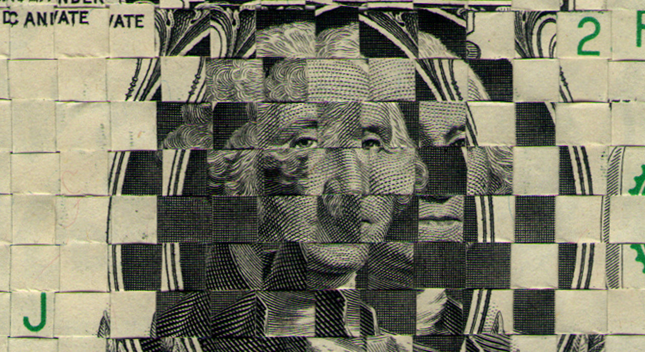 Una mazzetta di banconote da un dollaro con numerazione consecutiva ha fatto da base (100 banconote tagliate a mano in fettucce orizzontali ogni 4 mm) per un intreccio di altre 100 banconote (questa volta tolte alla circolazione per poi essere tagliate verticalmente ogni 4 mm). Con due ne produco una. Diversa, alterata per la serie di variabili che comporta l’operazione eseguita interamente a mano. Ne conseguono banconote molto diverse fra loro.