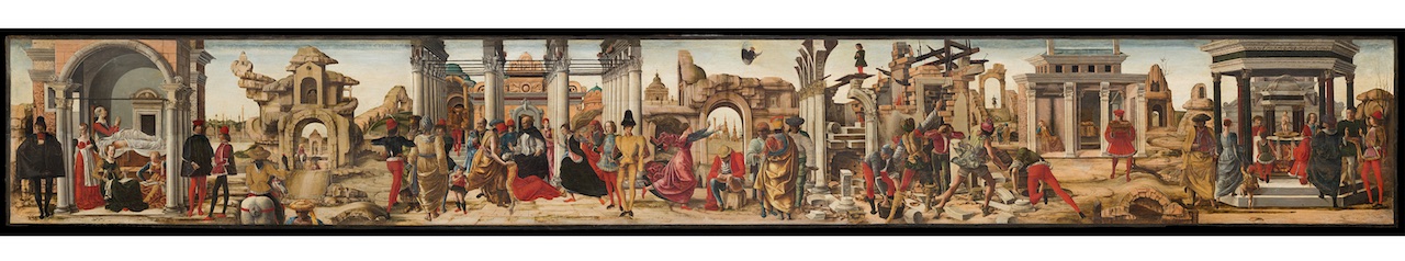 La superba pala d’altare dedicata a San Vincenzo Ferrer fu concepita per la cappella di famiglia di Floriano Griffoni all’interno della Basilica di S. Petronio a Bologna. La sua realizzazione, collocata tra il 1470 e il 1472, fu affidata al ferrarese Francesco del Cossa, allora all’apice della sua straordinaria carriera artistica, iniziata intorno al 1456 e stroncata dalla peste nel 1478. I contatti tra l’artista e il capoluogo emiliano, attivi per quasi un ventennio, si tradussero nella realizzazione di alcuni capolavori come l’Annunciazione di Dresda, la Madonna del Baraccano e la Pala dei Mercanti. Il Polittico Griffoni segnò l’inizio della sua collaborazione con il più giovane Ercole de’ Roberti, uno dei più formidabili sodalizi artistici del secondo Quattrocento italiano. Assieme a Cossa e de’ Roberti lavorò alla cornice il maestro d’ascia Agostino de Marchi da Crema. Attorno al 1725 il nuovo proprietario della cappella, il Monsignore Pompeo Aldrovandi, fece smantellare la pala e destinò le singole porzioni figurate a “quadri di stanza” della residenza di campagna della famiglia a Mirabello, nei pressi di Ferrara.