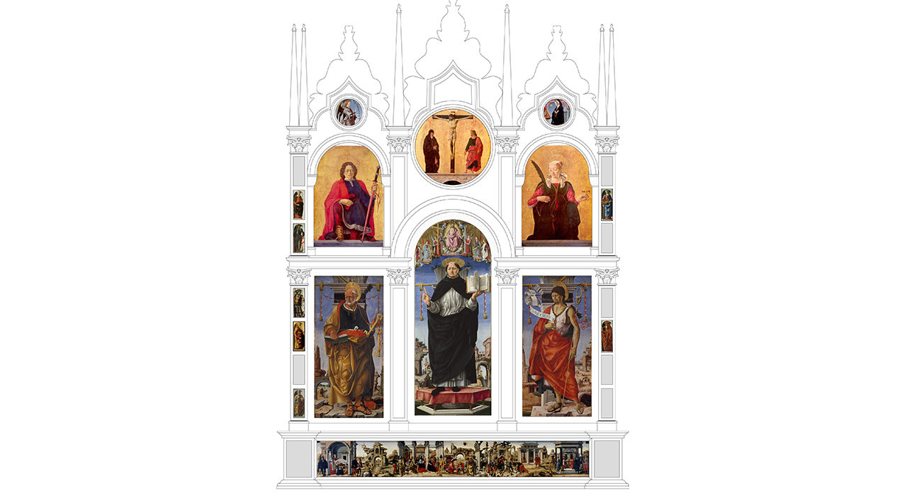 La possibilità di radunare per la prima volta, dopo oltre cinquecento anni, nella città per la quale fu creata l’opera tutti i pannelli esistenti (oltre il 90% dell’opera complessiva) di uno dei massimi capolavori del primo Rinascimento italiano rappresenta un’occasione di straordinario rilievo. Se il primo ad avanzare un’ipotesi ricostruttiva del Polittico fu, nel 1888, lo storico d’arte lombardo Gustavo Frizzoni, soltanto nel 1934 Roberto Longhi nella sua Officina Ferrarese ne immaginò un impianto molto più monumentale, vicino per struttura ai grandi polittici quattrocenteschi. Longhi accostò, infatti, agli elementi individuati da Frizzoni – le tre tavole del registro superiore conservate a Washington: Santa Lucia, San Floriano e la Crocifissione – altri magnifici elementi figurati, tra i quali, i due tondi con l’Annunciazione (Collezione Cagnola). Il ritrovamento, negli anni Ottanta, di uno schizzo del Polittico allegato ad una corrispondenza con Monsignor Pompeo Aldrovandi, fornì la prova documentaria dell’esattezza quasi totale dell’ipotesi di Longhi. La ricostruzione di Cecilia Cavalca, presentata in mostra, che prevede la presenza di almeno 7 figure di santi sui pilastri laterali, è ad oggi la più attendibile. La sezione della mostra – al primo piano di Palazzo Fava – è stata progettata da Roberto Terra dello Studio Cavina Terra.