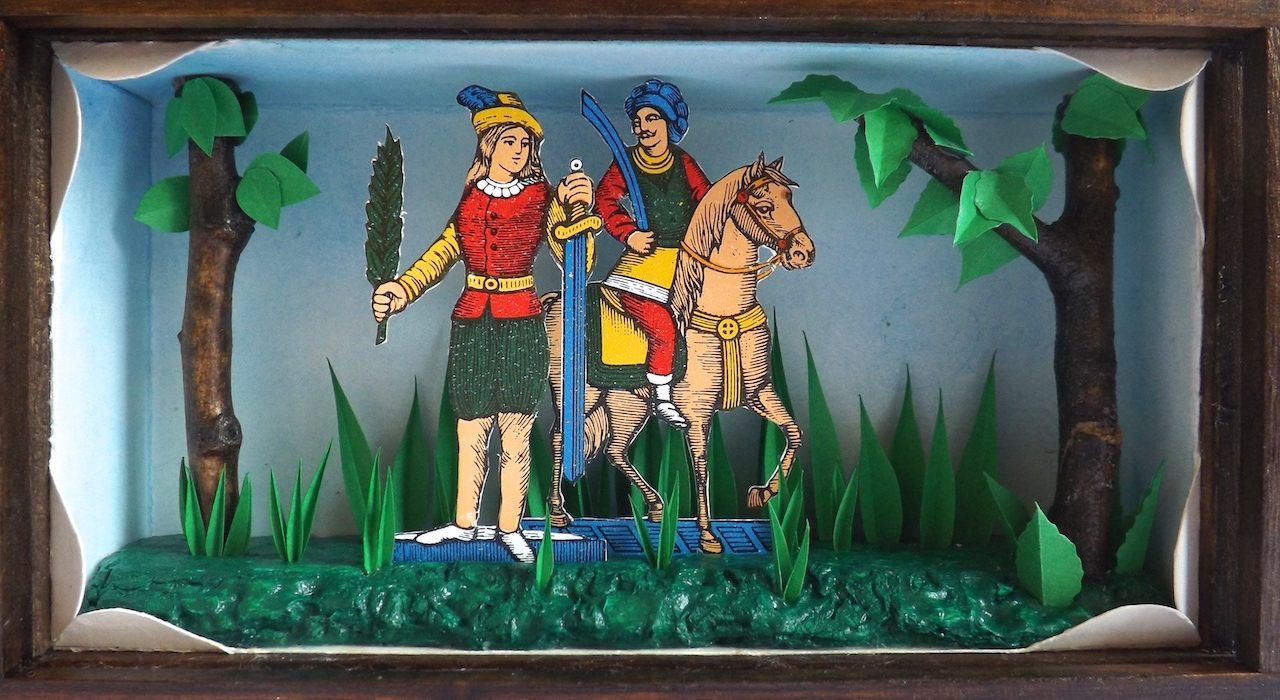 Le carte da gioco, invece, francesi napoletane marchigiane che siano, diventano storie d’amore, di cappa e spada, in cui s’intrecciano sguardi su un palcoscenico minuscolo, in un frame che congela un momento ma che accende l’immaginazione in chi guarda. Cosa si stiano dicendo un cavaliere e la sua bella, quale avventura egli racconti, di ritorno da una guerra o da un semplice torneo, in quale luogo si siano dati appuntamento per il prossimo incontro, non potremo mai saperlo. Simona mette in piedi un teatrino, il resto deve farlo lo spettatore, se si lascia catturare dal fascino discreto di quei mondi in miniatura.