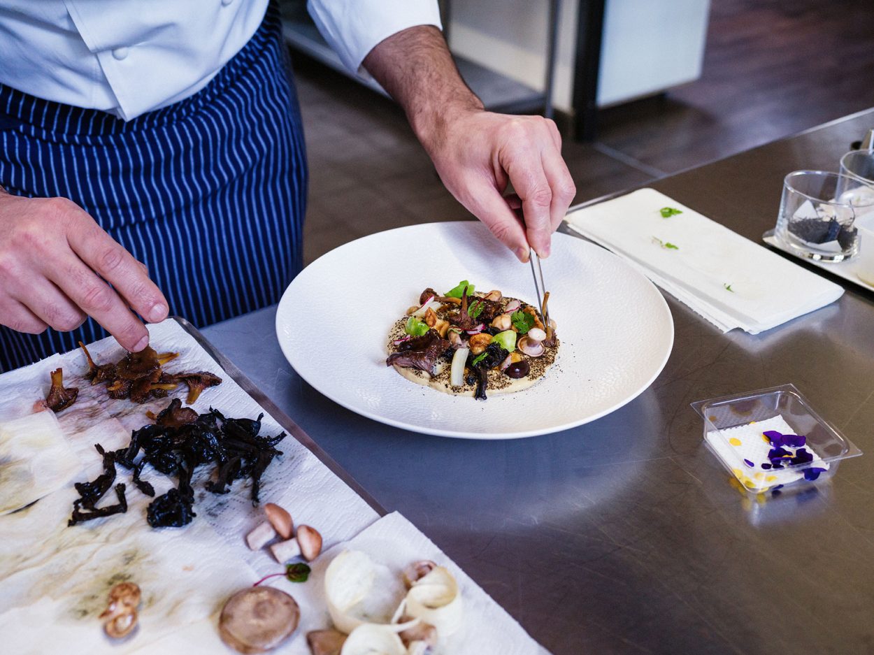 Tra le prelibatezze dello chef Antonio Guida, presentate attraverso un sorprendente live show, il piatto “Funghi crudi e cotti, polvere di fungo trombetta dei morti e salsa di uva passa”, presentato all’interno del libro Krug x Mushroom, creato mentre lo Chef degustava Krug Grande Cuvée a Reims e studiato per esprimere la stessa generosità dello Champagne.