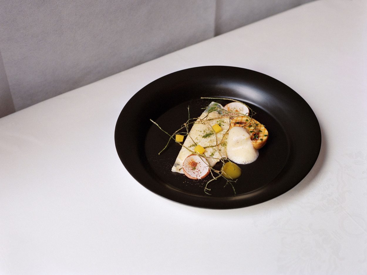 “Ho creato il piatto Funghi crudi e cotti, polvere di fungo trombetta e salsa di uvetta passa mentre degustavo Krug Grande Cuvée ed è studiato per esprimere la stessa generosità dello Champagne. La selezione di porcini, gallinacci e trombette crea un piatto vario ma anche armonioso, che contrasta bene gli accenni di miele e fiori appena sbocciati di Krug Grande Cuvée. La salsa di uva passa rispecchia i frutti maturi ed essiccati che si rintracciano nella Champagne, mentre emergono al palato verso la fine dell’esperienza di abbinamento” Antonio Guida (Seta, Milano)