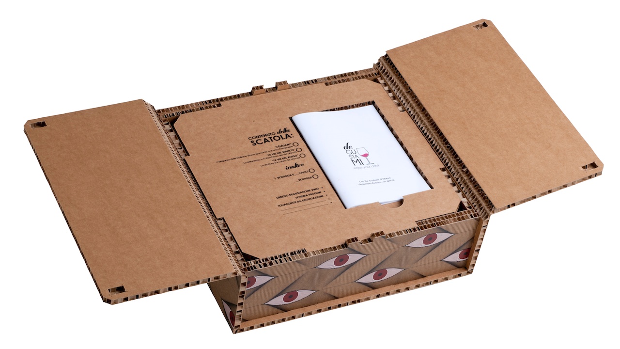 Le box De-Gustami, inoltre, eco-sostenibili e realizzate in cartone kraft, materiale completamente riciclabile e sono sono smontabili per ogni esigenza di trasporto e conservazione. Tutto il materiale cartaceo, ossia il libretto, la scheda profumi e le tovagliette, oltre alle scritte sulla box stessa, sono disponibili anche in lingua inglese, francese, cirillico e cinese.
