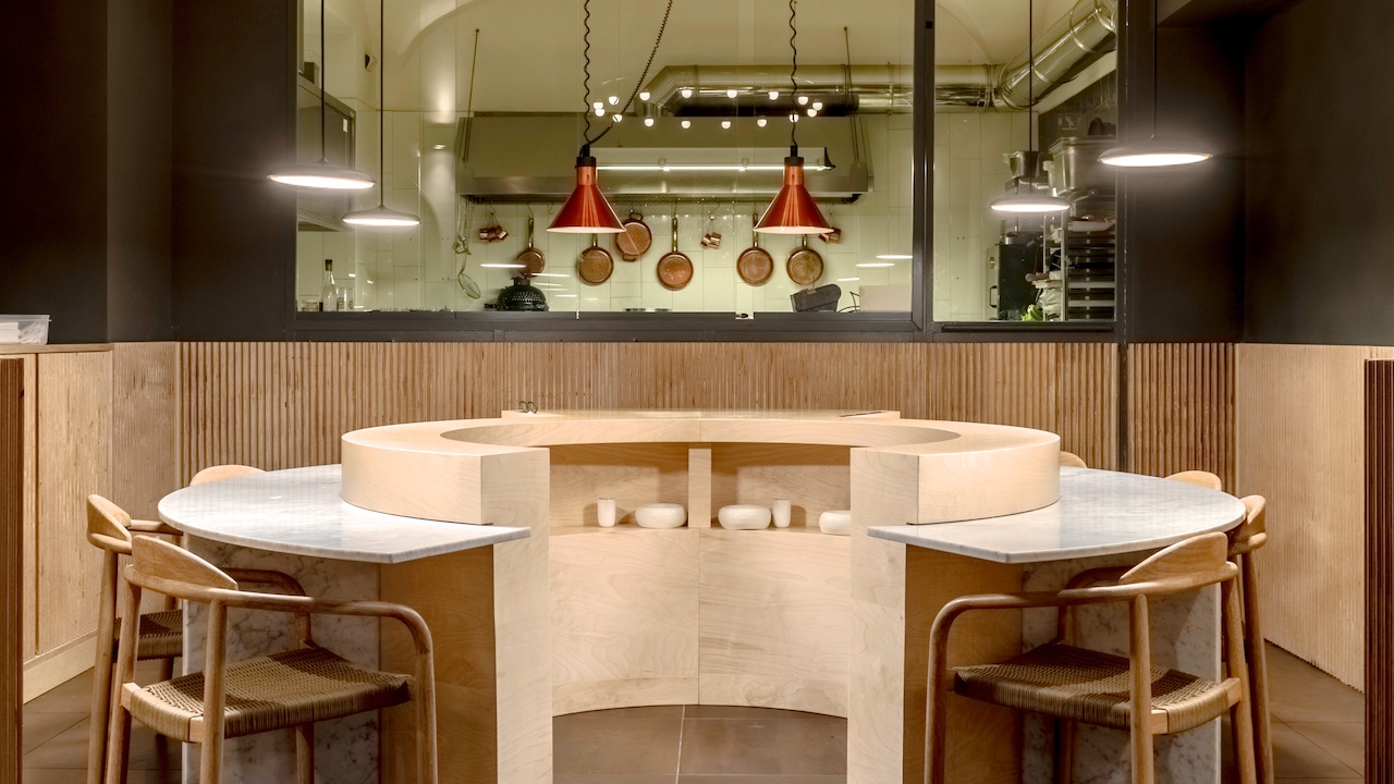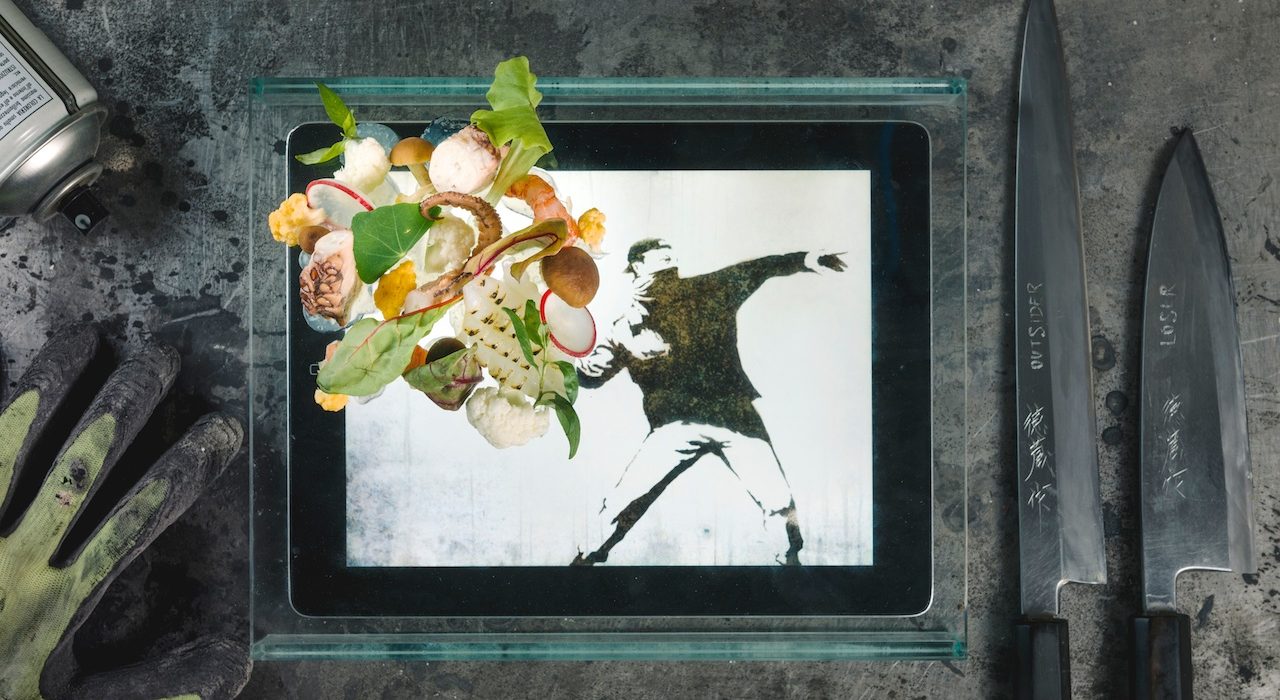 Stare a tavolo davanti allo chef significa stare al gioco, ammirare i movimenti coordinati di tutta la sua brigata, sorprendersi ad ogni portata e addirittura comporre il proprio piatto come nel caso di Kebab: una sorta di “Lego” composto da carne Wagyu, salse, verdure, condimenti e una piadina, da assemblare a proprio piacimento. Divertente il Cibo in scatola: sushi di sgombro, tagliatelle di seppia e crema con ricci di mare, servito tutto nelle piccole latte. Irresistibile la Scatola di cartone come se fosse da pizza che invece contiene una sorpresa: un buonissimo okonomiyaki. Delizioso il Gazpacho di melagrana servito con carpaccio di ricciola leggermente affumicata. La portata più “classica” è l’Anatra all’arancia: un petto tenerissimo con la pelle croccante, servito con la purea di carote all’arancia e la salsa all’arancia a specchio. Insalata di mare: sulla tavolozza di vetro troneggia una composizione di gamberi e calamari appena scottati e polpo tenerissimo con verdure croccanti qua e là. Sotto la tavolozza, invece, c’è un “intruso”: un iPad con l’immagine di Banksy…