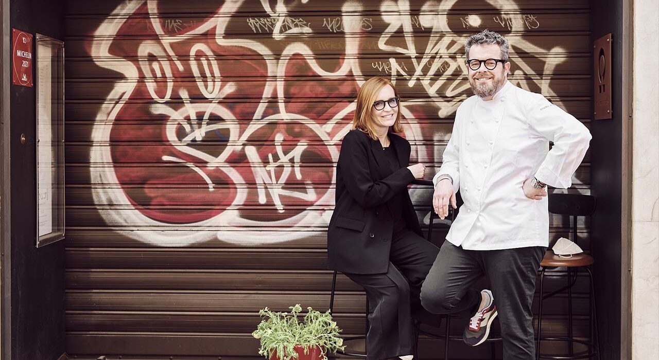 Infine, i due punti rossi, identità del ristorante: presenti sul tovagliato, sul menù e sulla pochette porta mascherina, mirano a sottolineare l’eleganza semplice e la sintesi tra passato e presente che sono i motori del progetto. Un progetto che oggi ha connotati congiunti e condivisi insieme a Carlotta Perilli.