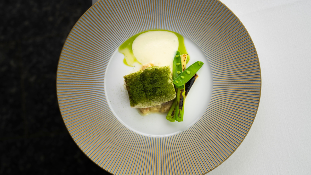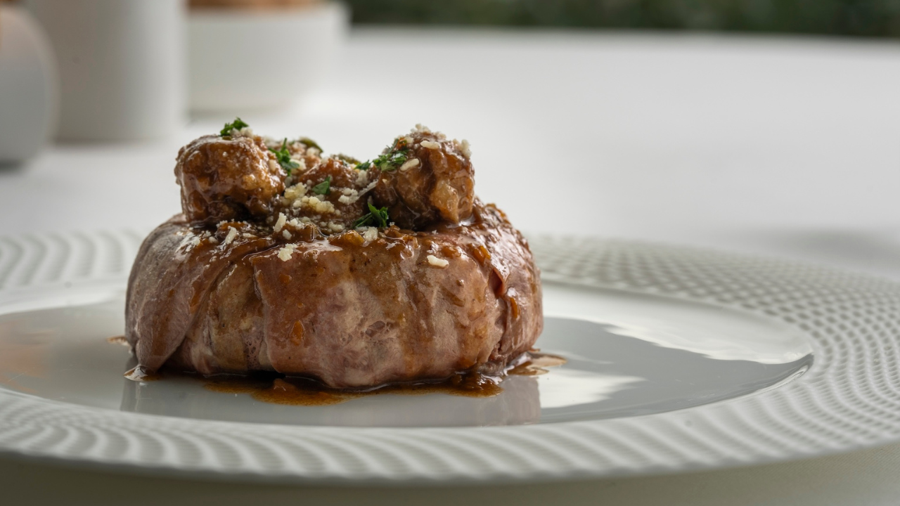 Un puzzle di ingredienti ineludibili, scelti accuratamente e portati a cottura con perizia estrema, come la lingua, che giunge da una particolare selezione di manzi svizzeri, salmistrata home made; insieme al burro Echirè di Charentes Poitou, considerato il migliore al mondo, prodotto in Loira e lavorato a mano, a bassa velocità, in un caseificio fondato nel 1894 e ancora Il riso Carnaroli Di Cristiana, coltivato in Lomellina, unico riso certificato biologico in Italia, con una resa perfetta, mai croccante, ma fondente e a completare un soffritto ‘di casa’, con concentrato di pomodoro, porcini di Borgo Taro e fondi di arrosto, che avvolgono le polpette di pancia di vitello e maiale, leggermente infarinate con burro e salvia e passate in padella. Dopo il super Savarin ci si potrebbe credere sazi, ma al piccione che arriva è difficile dire di no. È una versione estiva del nobile volatile, che cuoce al vapore e ben si integra con le foglie di bieta, l’acidità dello yogurt, la salsa di ciliegie di stagione, la freschezza e la nota asiatica del daikon.