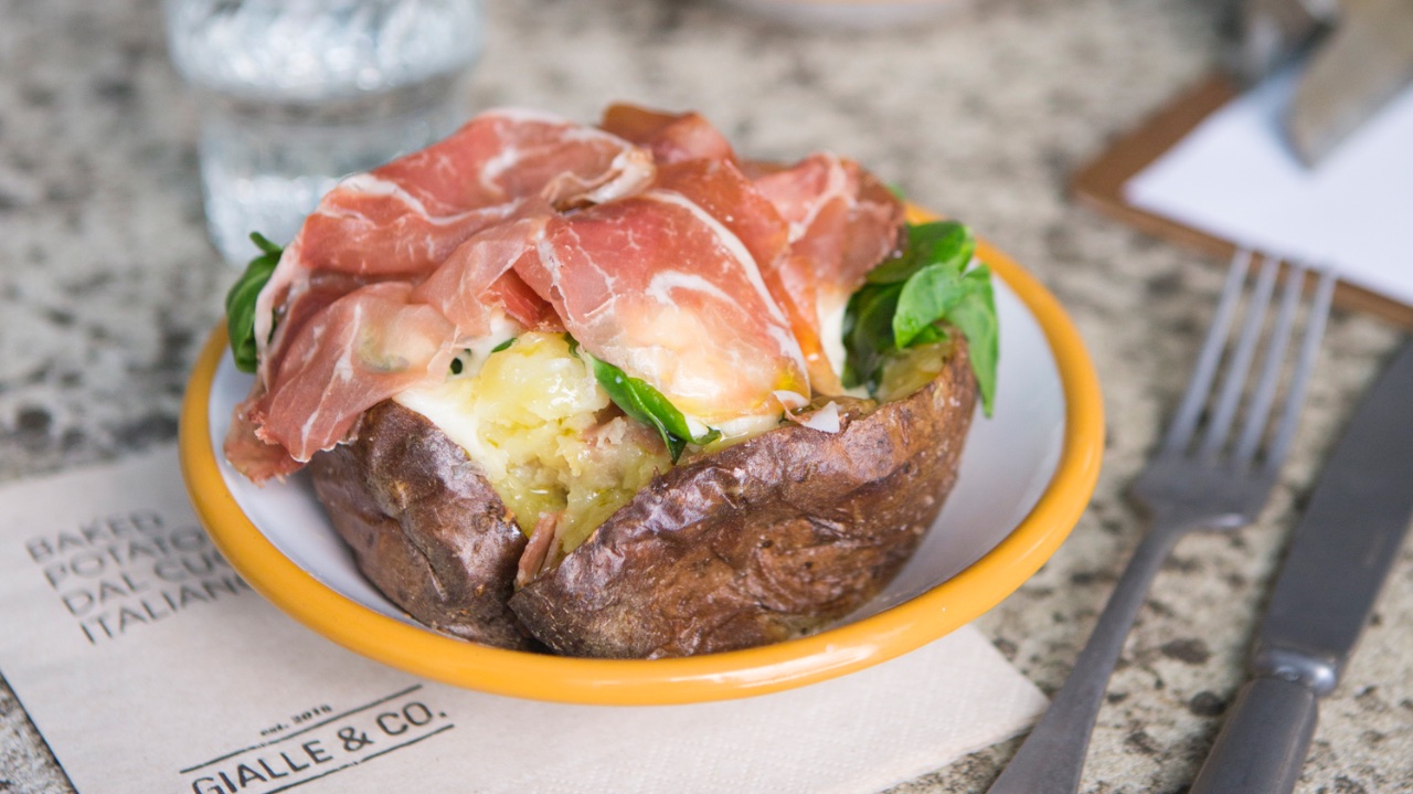 Tutto nasce dall’idea di cinque amici, durante un viaggio a Londra. Cercando qualcosa di tipico e poco distante dall’albergo la compagnia approda in un pub dove la proprietaria acclama a gran voce che qui si possono trovare le migliori baked potatoes della città. Ne ordinano diverse, dalla classica burro panna acida e bacon alla variante con pollo e salse, ma il tasting non è soddisfacente: pesantezza e gusto sciapo. Uno di loro decide quindi di sfidare la proprietaria a cucinare una baked potato all’italiana, in cambio di carpire i segreti della ricetta tradizionale. Quella notte nasce la prima ricetta della baked potato di Gialle&Co., la Threecolore con stracciatella, songino e pomodorini.
