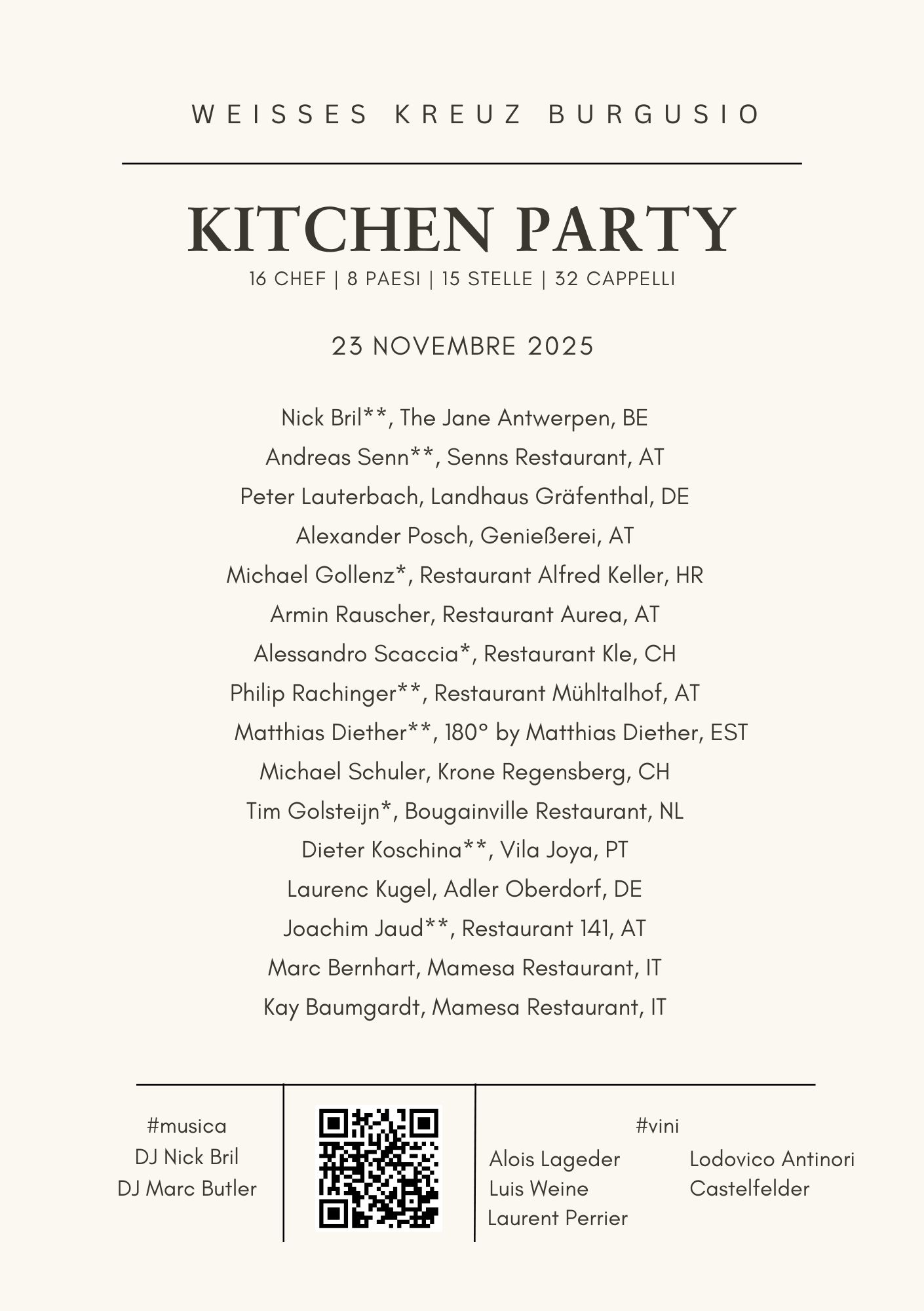 Il Kitchen Party al Weisses Kreuz non sarà soltanto una cena, ma una vera e propria festa dei sensi: un’occasione per incontrare da vicino i grandi maestri della cucina, degustare le loro incredibili creazioni e immergersi in un’atmosfera conviviale e raffinata, dove l’arte gastronomica incontra l’ospitalità altoatesina. La serata inizia alle ore 18:00 con un calice di Champagne Laurent-Perrier, preludio a un percorso libero e dinamico: gli ospiti si possono muovere liberamente tra postazioni, sale e cucine, degustando, chiacchierando e lasciandosi sorprendere a ogni angolo. Non mancheranno le cantine (Alois Lageder, Lodovico Antinori, Luis Weine, Castelfelder, Laurent-Perrier) che proporranno i loro vini pregiati affiancate da diversi produttori gastronomici con le loro invitanti specialità. E quando la notte avanza, la cucina lascia spazio alla musica: il DJ belga Nick Bril – che toglie la divisa da chef stellato per salire in consolle – insieme al DJ altoatesino Mark Butler da Merano trasformeranno il bar dell’hotel in un club vibrante, tra beats, drinks e joie de vivre, per rendere il Kitchen Party un appuntamento da vivere con tutti i sensi. Al timone della serata ci sarà il padrone di casa, lo chef Marc Bernhart, anima creativa del ristorante Fine Dining Mamesa, situato nell’hotel e aperto anche agli esterni, affiancato dal pastry chef della struttura Kay Baumgardt, che completerà l’esperienza con dessert visionari e fuori dagli schemi, capaci di sorprendere e incantare. Insieme a loro, 14 colleghi che rappresentano il meglio della scena internazionale: Nick Bril (due stelle Michelin – The Jane, Anversa, Belgio), che metterà in scena la sua cucina fresca, esotica e creativa; Alexander Posch (quattro cappelli Gault Millau – Genießerei, Graz, Austria), che propone una cucina territoriale, radicale e con radici profonde; Andreas Senn (due stelle Michelin e quattro cappelli Gault Millau – Senns Restaurant, Salisburgo, Austria), che ama descrivere la sua cucina affermando che “chi non abbandona mai sentieri battuti, arriva solo dove altri sono già stati”; Armin Rauscher (tre cappelli Gault Millau – Restaurant Aurea, Villach, Austria) con la sua cucina high-level fusion; Alessandro Scaccia (una stella Michelin – Restaurant Kle, Zurigo, Svizzera) che proporrà agli ospiti la sua cucina vegana moderna; Michael Schuler (Krone Regensberg, Regensberg, Svizzera) con la sua cucina tradizionale, francese, combinata con prodotti locali; Peter Lauterbach (un cappello Gault Millau – Landhaus Gräfenthal, Bindlach, Germania) che presenta la sua cucina tradizionale con influssi asiatici e francesi; Joachim Jaud (due stelle Michelin e quattro cappelli Gault Millau – Restaurant 141, Mieming, Austria), che propone la sua cucina austriaca con influssi giapponesi e francesi; Matthias Diether (due stelle Michelin – 180° by Matthias Diether, Tallin, Estonia), che mette in scena una cucina francese classica con elementi moderni; Michael Gollenz (una stella Michelin e quattro cappelli Gault Millau – Restaurant Alfred Keller, Hotel Alhambra, Croazia), con la sua cucina creativa con influssi mediterranei e francesi; Tim Golsteijn (una stella Michelin – Bougainville Restaurant, Amsterdam, Olanda), che ama sottolineare che “concede molta importanza ai sapori e agli aromi, poiché ogni sapore può essere abbinato a un determinato ricordo”; Laurenc Kugel (Landgasthof Adler Oberdorf, Oberdorf, Germania) con la sua cucina moderna ispirata alle radici sveve; Philip Rachinger (due stelle Michelin e quattro cappelli Gault Millau – Hotel Restaurant Mühltalhof, Neufelden, Austria), che presenta la sua cucina austriaca con visione moderna; Dieter Koschina (due stelle Michelin – Villa Joya, Algarve, Portogallo), che propone una visione di cucina fedele al suo mantra, ovvero “sentirsi come a casa, assaporando il paradiso”.