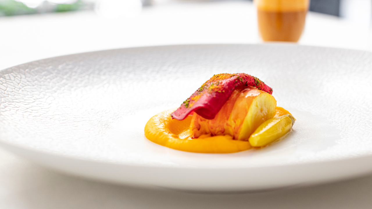 Aragosta alla curcuma con mousseline di carote, barbabietola agli agrumi, alloro e caciucco