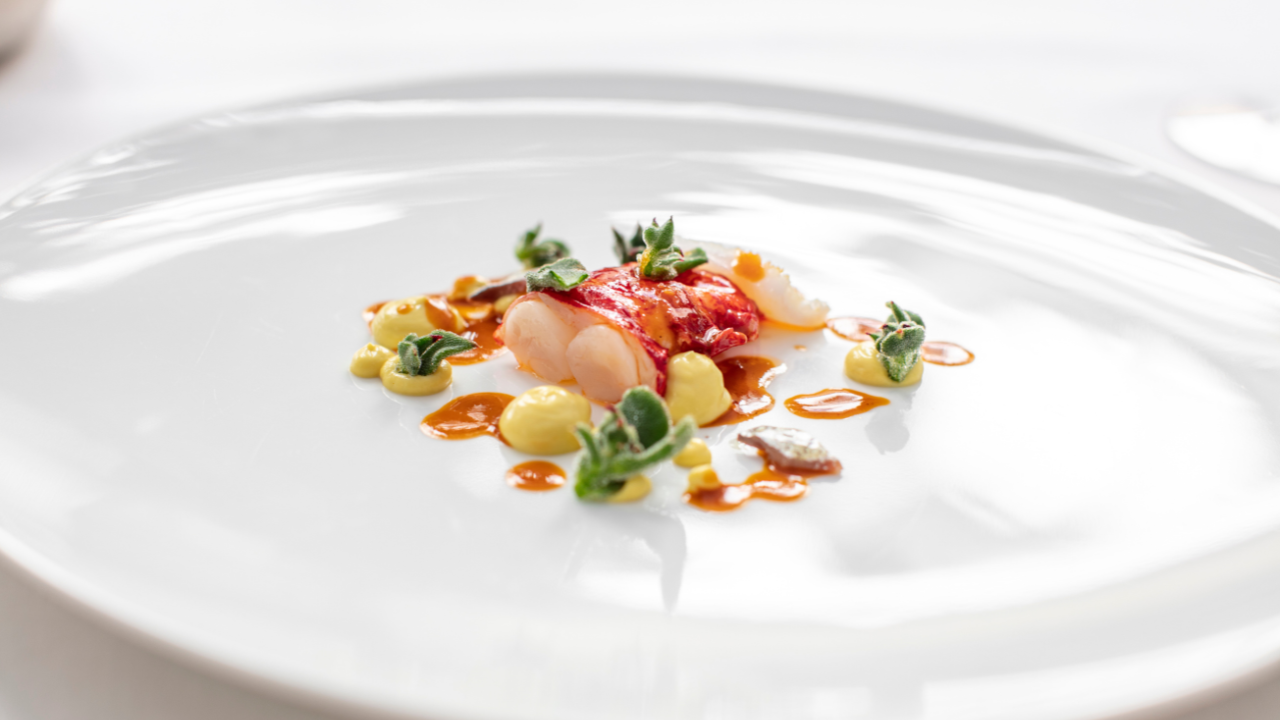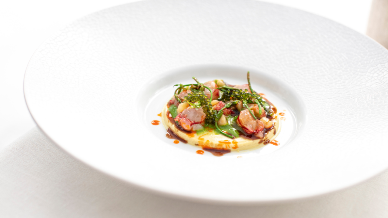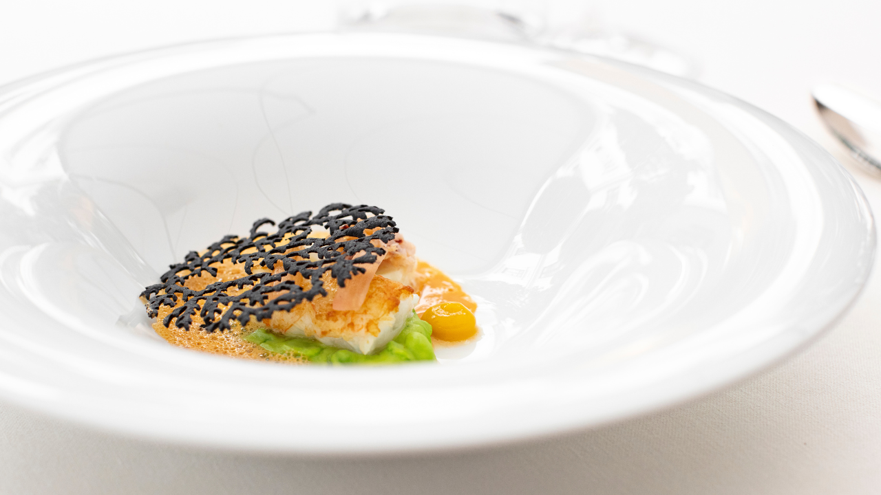 Due servizi per l’Aragosta come tributo alla circolarità dell’ingrediente: eticamente ispirato, Antonio Guida ha ideato un consommé dal tepore esaltante per i compendi floreali, tra accenti di pompelmo ed erbe officinali. La coda del crostaceo, nell’abbraccio di curcuma e mousseline di carote, vela di barbabietola infusa agli agrumi, polvere di alloro ed elisir cacciucco, eleva la sua opulenza, sublimando ogni dolcezza nella somma delle screziate valenze identitarie, oltre le analogie, nell’essenza assoluta di ogni componente.
