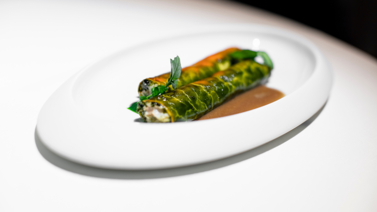 I Cannelloni ripieni di magnosa, in salsa ai funghi e crescione, sono un’ode all’heritage delle sfoglie all’uovo italiane ripiene: un trompe-l’oeil del carapace ottenuto con pennellate artistiche del corallo, nella sorprendente vivacità della salsa ai funghi, emblema di un idillio perpetuo, quello mare-monti.