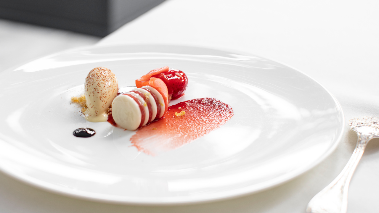 Il sorbetto al levistico, con mirepoix di pesca e ribes nero, sottolinea la visione carismatica e luminosa dell’executive pastry chef Marco Pinna sull’utilizzo dei vegetali in pasticceria, nell’armonia ricercata del menù. La Fragola viene magnificata con la salsa all’aceto balsamico ed il gelato al sesamo, tributando al cedro la carezza esperidata.