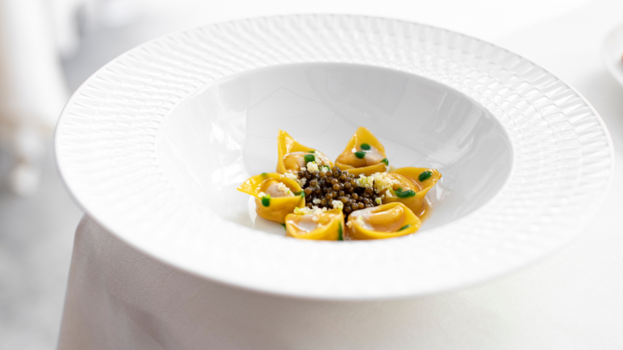 Tortellini con mazzancolle e triglia, salsa allo sgombro e caviale