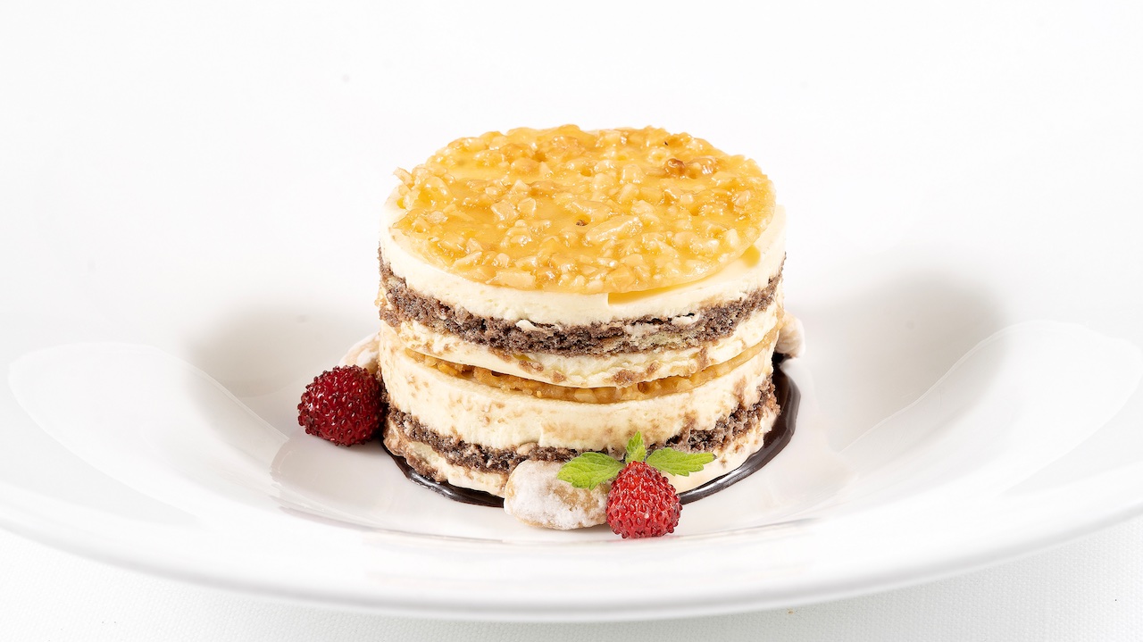 Semifreddo allo zabaione con sablé alle mandorle e salsa al cioccolato
