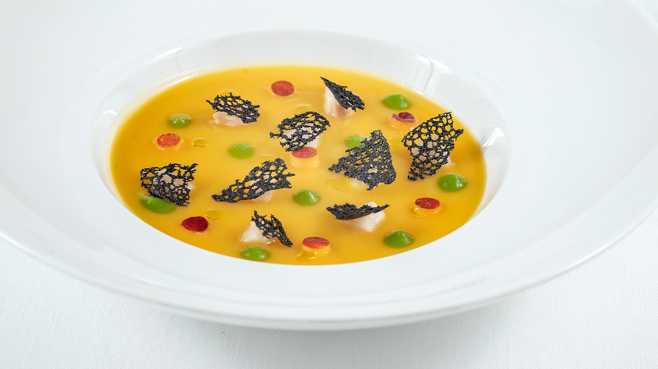 La zuppa fredda è una rivisitazione del gazpacho, personalizzata dallo chef grazie all’utilizzo dei datterini gialli, il baccalà affumicato e i chips al nero di seppia. L’aggiunta della pesca noce conferisce una nota dolce e un piacevole tocco di croccantezza per contrastare la consistenza vellutata della zuppa. Piatto molto estivo, da non perdere.