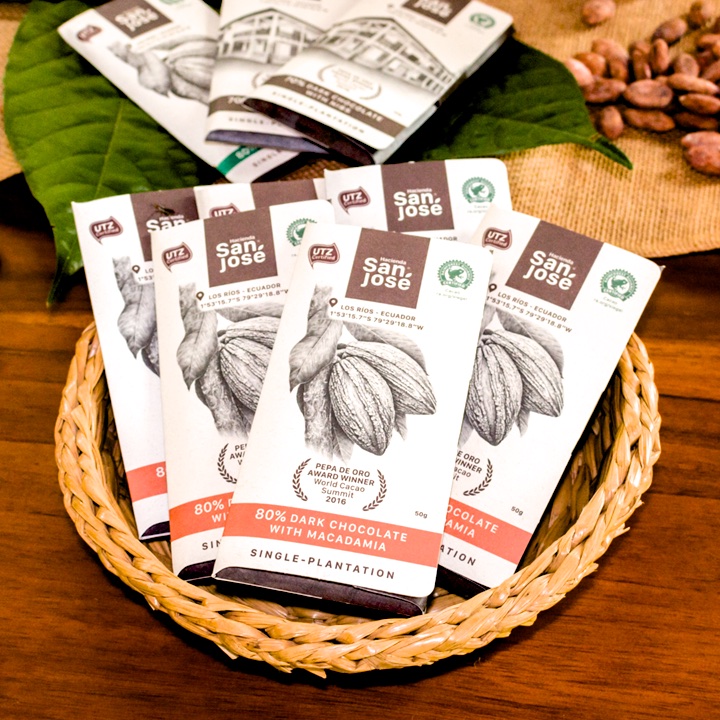 Infine, nella terra, l’Ecuador, in cui la coltura del cacao è tradizione da più di duemila anni, Hacienda San José segue il ciclo produttivo del suo cioccolato dall’origine al prodotto finito. Il cacao proviene da un’unica piantagione a Los Rios, in Ecuador ed è lavorato direttamente in loco. Nello stesso luogo esso è infatti coltivato, raccolto, fatto fermentare ed essiccato con tecniche avanzate e perfezionate nel corso di 90 anni di esperienza. Il cacao Nacional Arriba coltivato da Hacienda San José è stato più volte premiato fino a ottenere il riconoscimento “Pepa de Oro” al World Cacao Summit nel 2016. Questi chicchi hanno un aroma particolare, molto floreale con un’acidità minima, caratteristiche ideali per ricavare un cioccolato di altissima qualità. Hacienda San José spicca inoltre perché opera secondo un modello di business basato su principi della sostenibilità ambientale e sociale che supera di gran lunga gli standard richiesti (chocolatesanjose.ec).