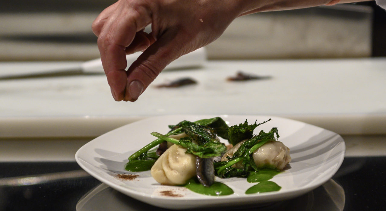 Si parte dal Montefeltro e da Tiziano Rossetti de l’Angolo Divino di Urbino. Nel suo racconto una spesa ancora lenta, fatta al mercato rubando consigli ai contadini per poi tornare ai fornelli e lasciare spazio alla leggerezza e alla gentilezza. Nel suo Brodo di Canocchie, carciofo e branzino, perché non lo si può dimenticare il gemellaggio quasi siamese con Pesaro, le canocchie sono state cotte come una bisque, donando al fondo quel colore che ha il Palazzo Ducale quando il sole gli tramonta addosso; le lische e le teste sono diventate prima un brodo poi una mousse delicatissima con un sapore intenso grazie all’olio di Cartoceto, a ricordare che la cucina marchigiana è fatta soprattutto di questo, di piani B per non buttare via nulla. Infine il vegetale, in questo caso il carciofo, a donare quel sapore un po’ ruffiano che sa di orto dietro casa.