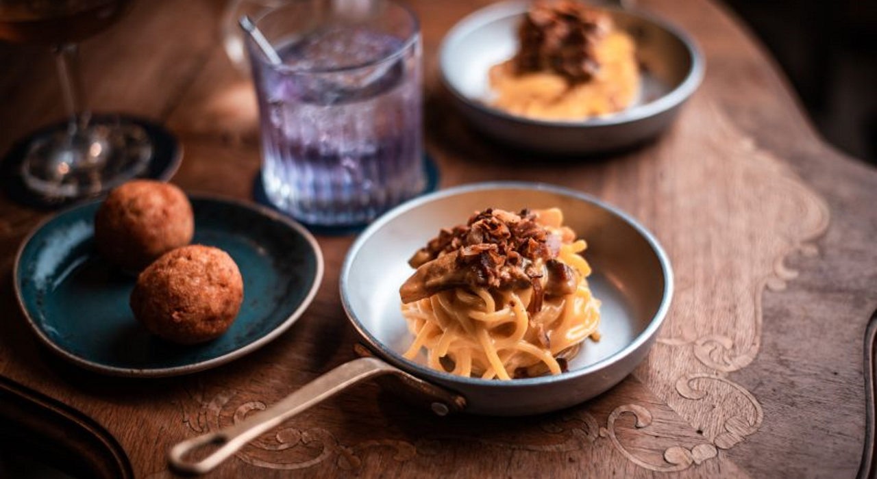 Spazioso, arioso, rilassante ed accogliente, il locale visualmente è diviso in due parti: una più elegante, con divanetti e poltroncine in velluto color petrolio, tavoli di tonalità cipria, specchi, stucchi e altri dettagli raffinati; l’altra rappresenta fedelmente un’osteria: pareti antichizzate, tavoli di marmo, antiche sedie di legno scuro.