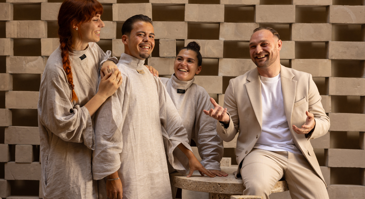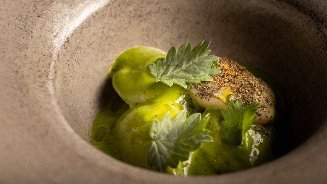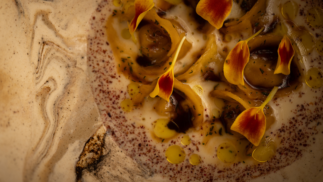 I totem nascondono gli elementi funzionali quali posate e tovaglioli; i larghi tavoli in legno e le sfumature tra argilla e calde terre regalano all’ambiente un’aura contemplativa ma accogliente. Al timone della cucina c’è Giulio Zoli, uno chef romano con diverse esperienze importanti, anche stellate, alle sue spalle, che gli hanno permesso di creare il proprio stile, contemporaneo e personale. Uno dei suoi tratti distintivi sono le salse: non semplici accompagnamenti, ma strumenti essenziali del racconto gastronomico che connettono tempi, culture, terre e memorie.