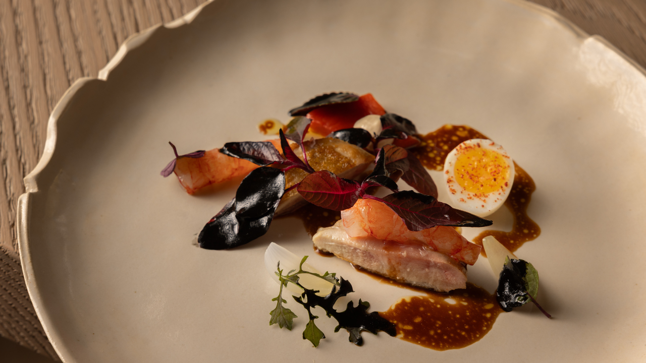Infine la quaglia, cotta al barbecue, con gambero rosa crudo, peperone arrostito, cipolletta borettana sott’aceto, salsa tonnata e uovo poché di quaglia, misticanza al nero di seppia e una salsa intensa di quaglia e teste di gambero, contornata da un samosa di zampette in stile thai con XO sauce, è un simbolo di armonia fra contrasti e stratificazioni, tra terra e mare, crudo e cotto, croccante e fondente, l’Asia e il Mediterraneo.
