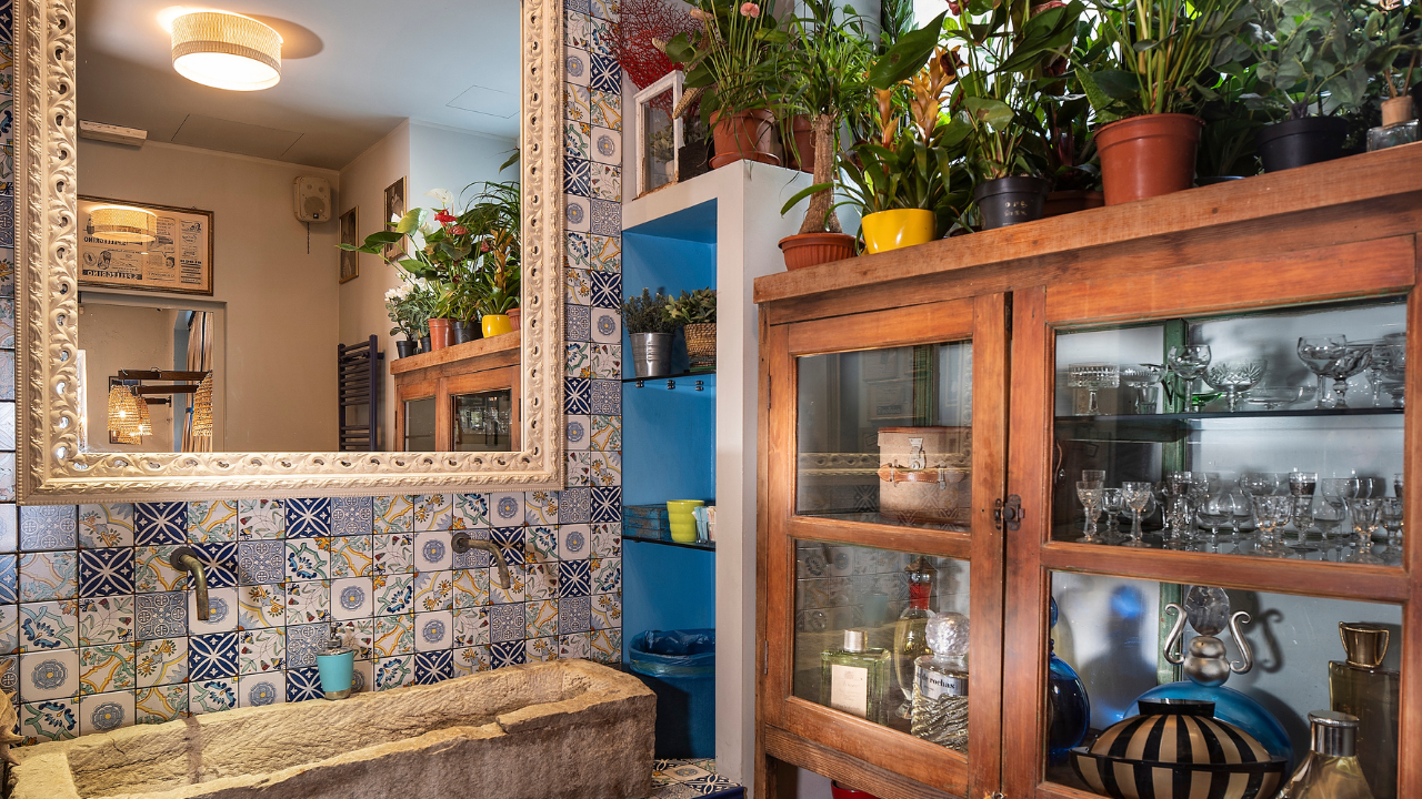 La location è accogliente e invita a una convivialità mai sopra le righe, la mise en place è garbata, i colori sono quelli delle calde tonalità di legno di tavoli, sedie e pavimenti; le due originalissime pareti di fondo delle sale, in realtà gigantesche lavagne che ricoprono tutta la superficie decorate a gessetto, sono divise dalla cucina a vista, caratterizzata dalle panelle bianche tipiche delle pescherie, rese originali da un mosaico coloratissimo di piastrelle di Vietri.