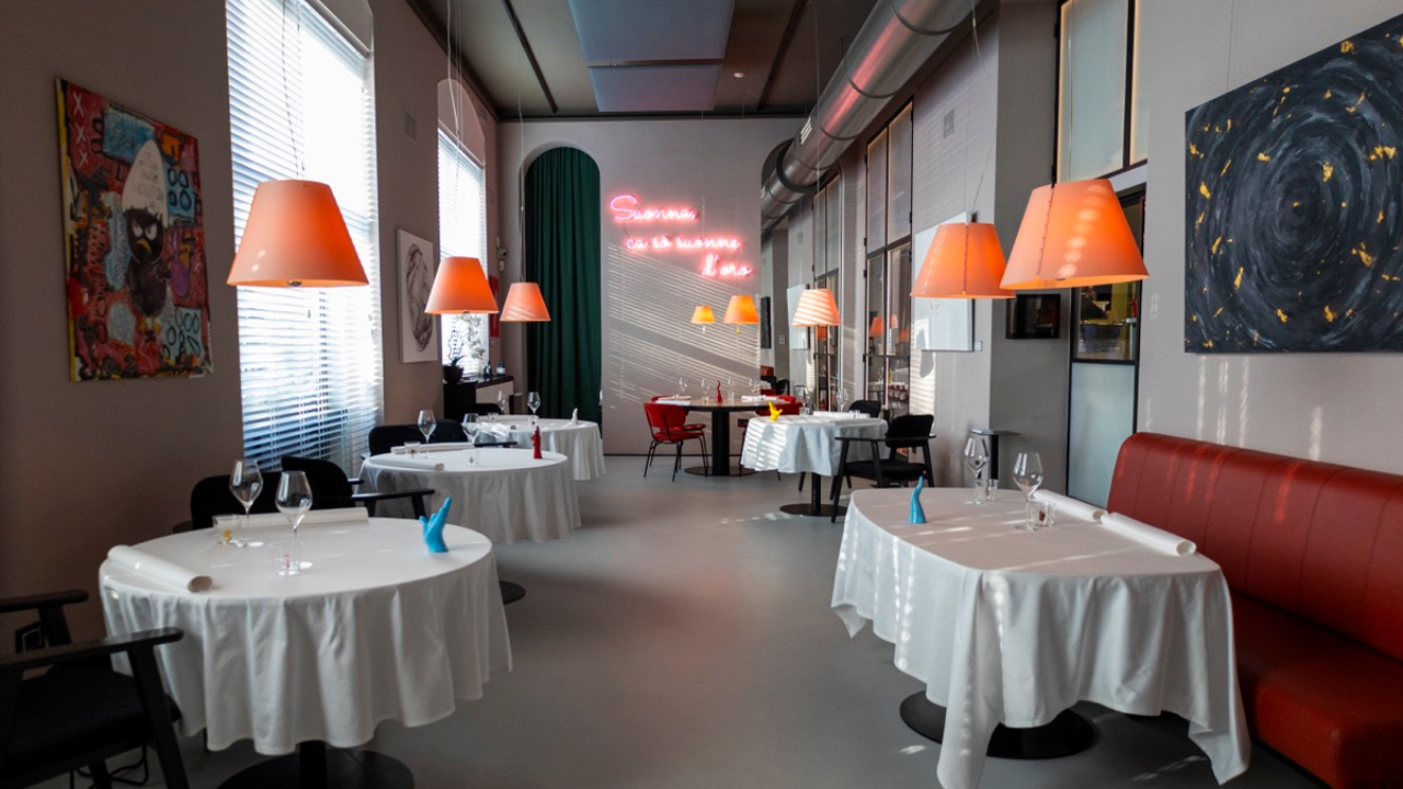 Lo chef Roberto di Pinto e la sua crew partono con il piede giusto: la location è di forte identità, con giochi di chiaro e scuro che non litigano con i colori e gli arredi del ristorante. Già, il ristorante: talmente particolare nella sua architettura che non sembra neppure tale. Del resto, in origine era un’officina di moto, recuperata con garbo e idee. Piuttosto, in certi angoli, parrebbe quasi parte di un’abitazione signorile.