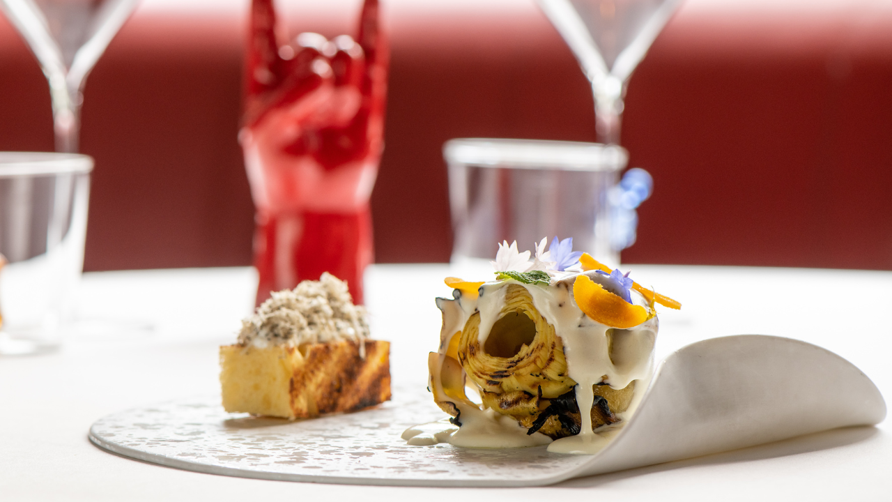 Nel piatto c’è tutto quello che il tempo e le esperienze gli hanno trasmesso, a partire dal risotto Milano/Napoli per arrivare al Babà tra sacro e profano abbinato a un gelato al pop corn, passando attraverso astice, cavolo viola, caprino e gazpacho d’uva o lo sgombro ’45’, tzatziki, rapa rossa e salicornia.