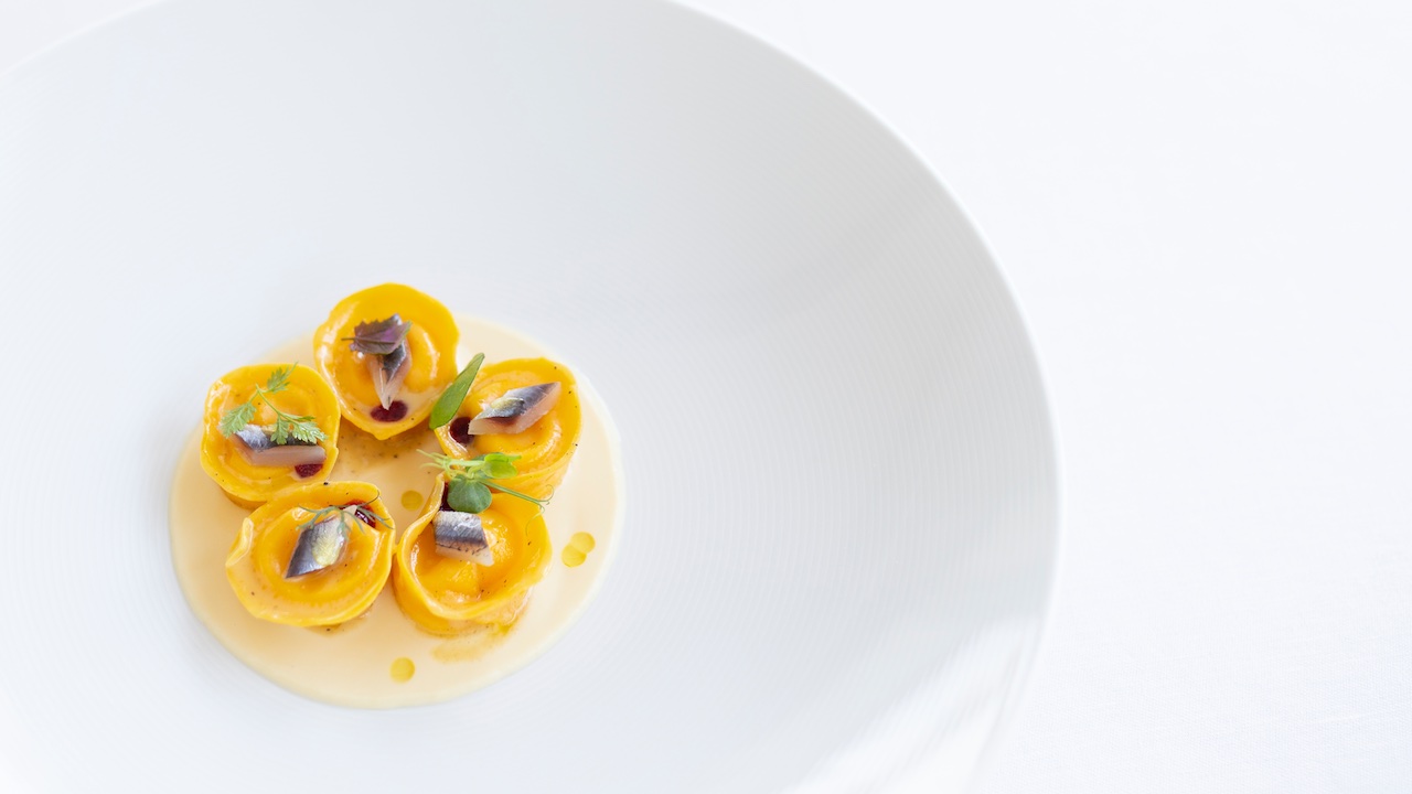 Il tutto è condito di grande equilibrio, ben costruito su una modernità per nulla scontata ma nello stesso tempo figlia di tecnica e di quella cultura stratificatasi su viaggi ed esperienze. Qualche volo pindarico nel lusso del King crab al vapore, patata viola, Champagne e caviale di aringa affumicata, mentre fanno pace con la tradizione i Ravioli farciti di baccalà, vellutata di ceci, yogurt e nero di seppia o il Trancetto di pesce spada proveniente dalla Sicilia cotto in una mix di spezie indiane dove la curcuma, tra le più riconoscibili, si fonde nella crema di carote, crema di mandorle, gel di limone e una salsa diavola leggermente piccante.