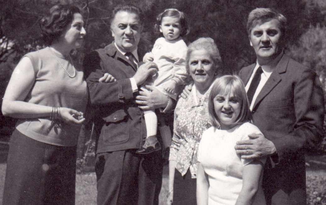 Da sinistra Maria Maddalena Fellini, Federico Fellini con in braccio la nipotina Francesca, Ida Barbiani (nonna di Francesca) Riccardo Fellini e la figlia Rita a Villa Fellini Fregene