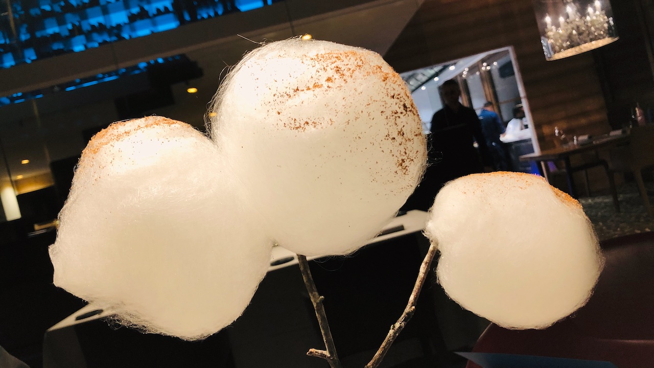 Cracker bianco con fiordaliso e caviale di salmerino: ritorna sull’acidità e sulla grassezza, rendendole un soffio di piacevolezza assoluta. Di incredibile persistenza.