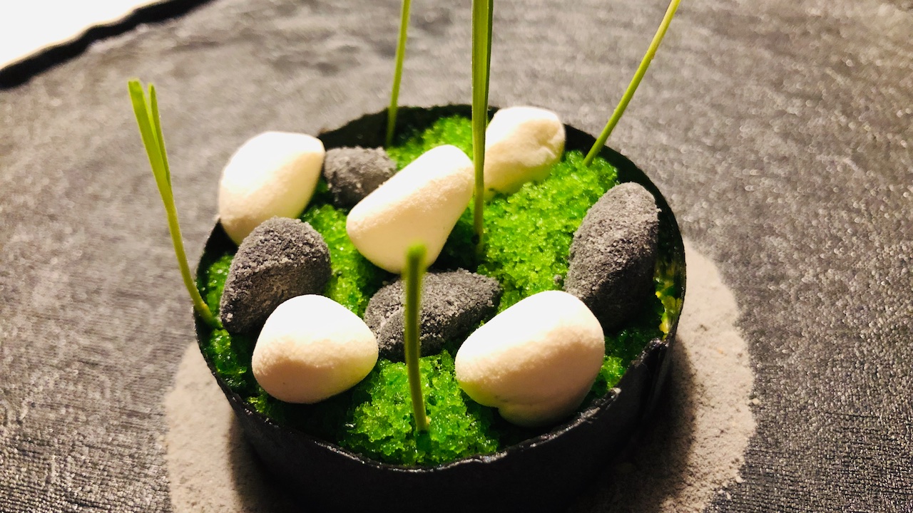 Salmerino con latte bruciato, olio d’aneto e perle nere: siamo nella testa dell’Alto Adige, nella sua volontà di elevarsi a vette da grande cucina francese. Un mosaico di incastri mirabile tra grassezza, acidità, vegetale, croccantezza.