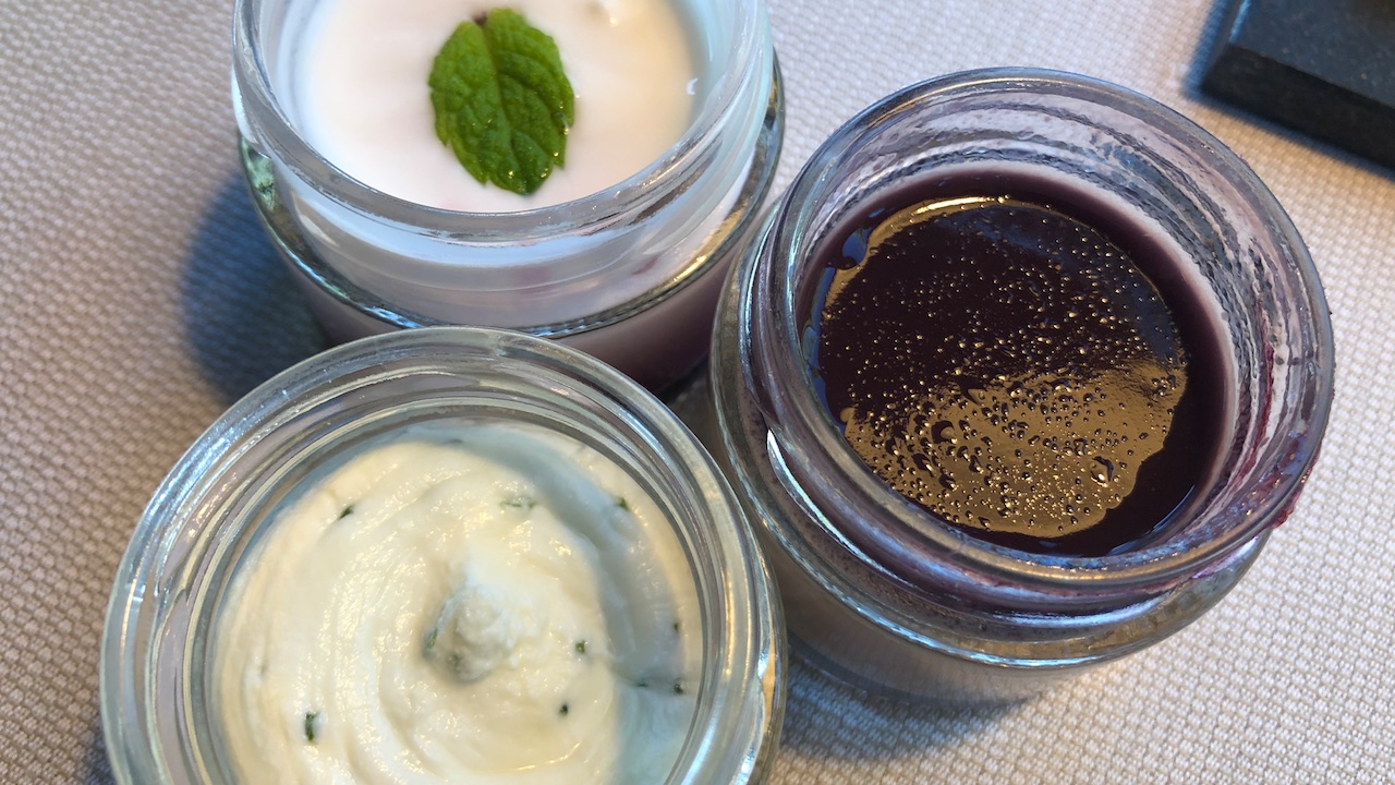 Yogurt ai mirtilli neri con menta, Patè di anatra con gelatina al Porto, Ricotta alle erbe