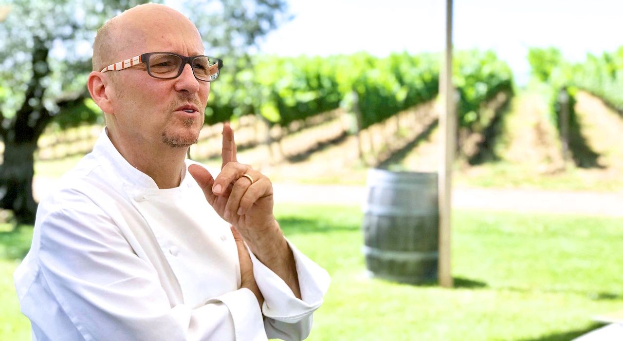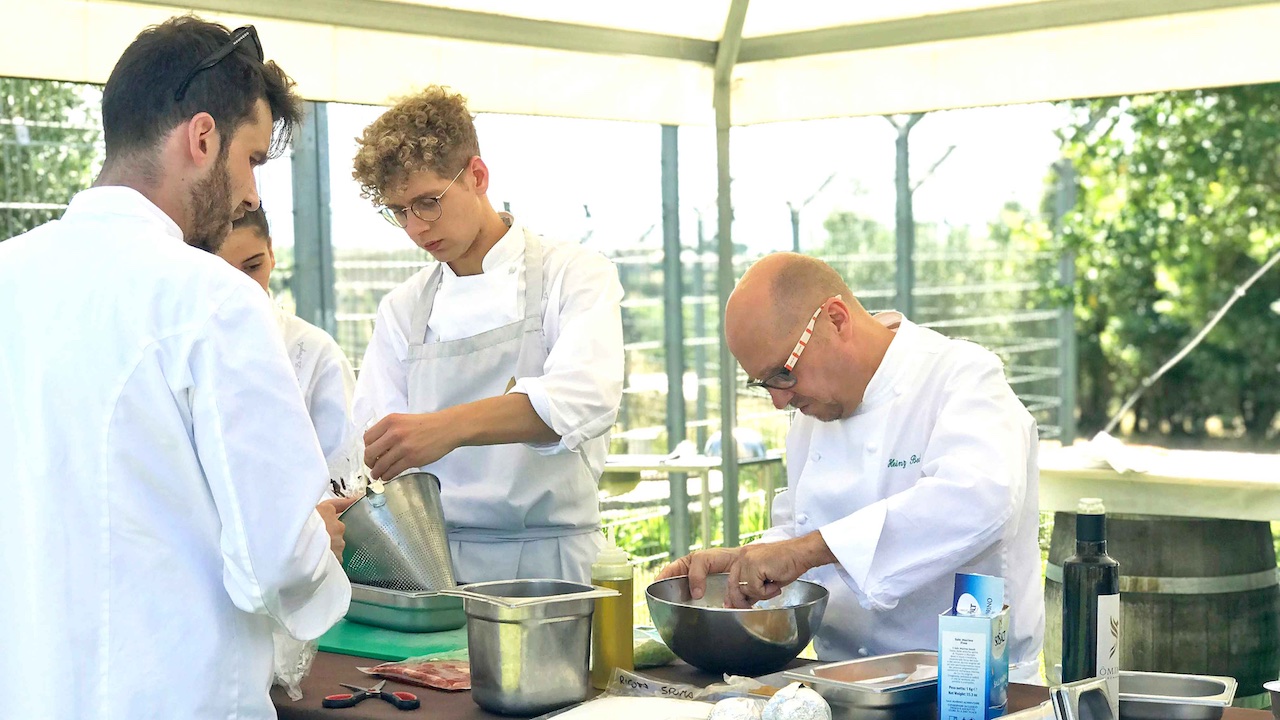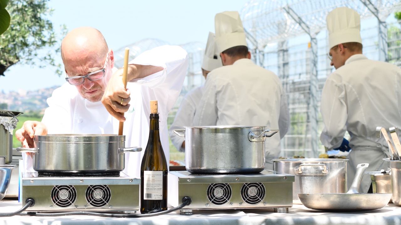 Heinz Beck non aveva a disposizione la sua cucina super accessoriata e tanto personale, ma una cucina molto semplice attrezzata all’aperto, con due fornelli, un lavandino e tre ragazzi della sua squadra. E qui che traspaiono il talento e le capacità dello chef tristellato: l’esecuzione perfetta di ogni dettaglio di ogni singolo piatto in condizioni quasi precarie. Tanto di cappello. Numerosi i vini in degustazione, non solo per conoscere al fondo la produzione dell’azienda, ma anche per giocare con profumi, sapori e abbinamenti con i piatti di Heinz Beck.Tre i capisaldi da esplorare per primi: Chardonnay e Merlot linea Ars Magna e Diana Nemorensis, una cuvée delle classiche varietà bordolesi Merlot, Cabernet Sauvignon e Cabernet Franc. Seguendo l’accostamento metaforico della tavola medievale “Ars Magna” di Raimondo Lullo, lo Chardonnay si rispecchia nel Principio “Bonitas”, sostantivo che esprime bontà, buona qualità, così come onestà e anche fertilità. La selezione purissima e di estrema scrupolosità permette alla varietà di esprimere tutta la sua potenza aromatica e mineralità. Giallo dorato il colore del vino nel bicchiere, al naso è intenso ampio, con i sentori di frutta a polpa bianca, fori ed erbe aromatiche. In bocca è equilibrato, armonico e coinvolgente. L’accostamento metaforico della tavola medioevale “Ars Magna” di Raimondo Lullo, questo Merlot è rappresentato da “Sapientia”, in quanto risulta didattico per l’interpretazione pura e immediata della sua inconfondibile struttura e gamma di ricche nuance. Viene ottenuto esclusivamente dalla accurata scelta del miglior clone; questo vino è in grado di regalare una esperienza sensoriale intensa. Color rosso rubino nel bicchiere, al naso si esprime attraverso l’immediata seduzione. Piccoli frutti rossi, spezie e tabacco sono le sue caratteristiche principali olfattive, in bocca invece è corposo ed elegante, sapido e persistente. Diana Nemorensis, un blend di Merlot, Cabernet Sauvignon e Cabernet Franc, è dedicato alla dea romana della caccia e incantevole protettrice della femminilità, che rappresenta l’eleganza e la forza della natura. Nel bicchiere di presenta di un color subito con i riflessi granato. Al naso arrivano le note di lamponi e amarene miste al cacao e tabacco. Avvolgente al palato, è setoso, dai tannini morbidi, intenso e persistente. Gli altri vini erano Chardonnay, Viognier e Cesanese, due vitigni internazionali e uno autoctono. Lo Chardonnay è un vino di carattere, con una forte componente minerale, intenso e complesso, dai profumi di pesca bianca e di macchia mediterranea. Il Viognier nell’Ars Magna è associato a “Virtus” in quanto sinonimo di valore, perfezione morale, onestà, rettitudine che ben si accostano al lavoro scrupoloso dal vigneto fino alla bottiglia. Giallo dorato brillante nel bicchiere, al naso è intenso e piacevole grazie alle note agrumate e sentori di erbe aromatiche. Al palato invece è fresco e persistente. Il Cesanese è una varietà autoctona laziale, un vitigno a bacca nera, diffuso nella zona sud della provincia di Roma. Rosso rubino trasparente a vista, al naso si avvertono le note di frutti di bosco, di spezie e di violetta. Fruttato e minerale al palato, è fresco, elegante e persistente, dai tannini vellutati.