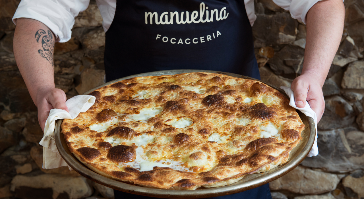 Un luminoso domani attende Manuelina, ma va guadagnato giorno dopo giorno, dedicandosi anima e corpo a quell’insegna che entra nel cuore dei recchesi. Poi nei primi anni del Novecento, Manuelina intuisce che il futuro è nello street-food e si ingegna nel reinterpretare le focaccette fritte farcite di formaggio tipiche della zona, amate da Cavour, Mameli e Stendhal, creando quello che diventerà uno dei piatti più celebri della cittadina e forse della regione, ispirandosi a una focaccia di antica memoria, che potrebbe essersi originata al tempo delle invasioni saracene, o forse risalire ad epoca romana, con il nome di Scribilita. A Recco, il paese di Luigi Tenco, Paolo Villaggio e Maurizio Crozza, Manuelina prepara una focaccia a cui pochi riescono a resistere. È un’impasto con farina, acqua, sale, olio, con cui si ottengono due sfoglie sottilissime farcite con prescinsêua, una sorta di stracchino con una marcata parte acidula, che conferisce quel sapore caratteristico e viene impiegato anche nella preparazione dei pansoti, della torta pasqualina, delle torte salate tipiche liguri e dei barbagiuai (ravioli di zucca fritti). Da allora, grazie al passaparola l’insegna aumenta la propria notorietà in modo esponenziale, rimanendo sempre di proprietà della stessa famiglia, che oggi è ben rappresentata nella conduzione di Cesare Carbone, pronipote di Manuelina.