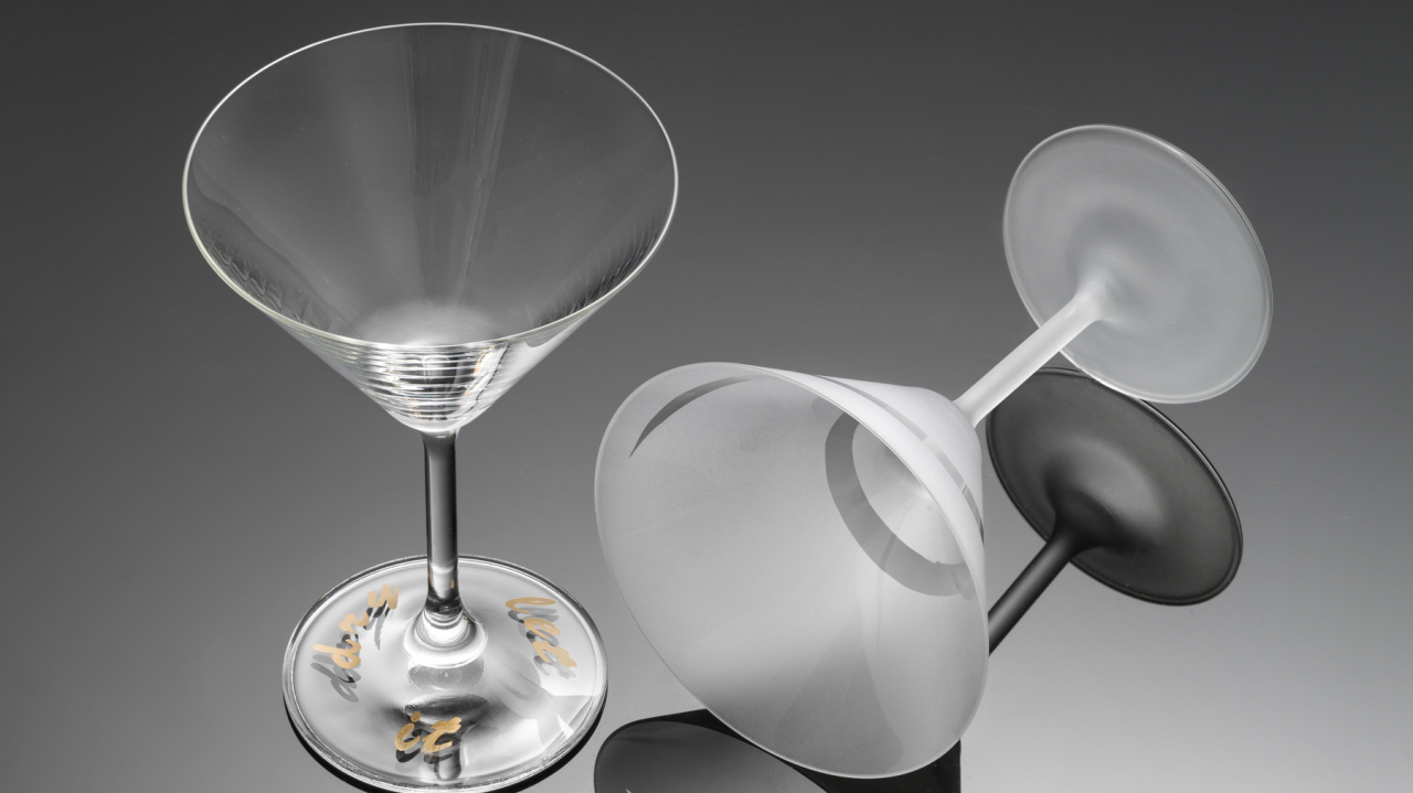 Alessandro Palazzi sceglie la classica coppa da cocktail singola e decide di presentarla in due varianti: una con l’effetto givray, che la ricopre tutta, come se fosse stata appena passata in freezer, tranne una piccola parte che permette di intravedere l’eventuale guarnizione inserita all’interno del bicchiere. L’altra che si caratterizza per la scritta apposta sul piede, «Let it dry»: un chiaro riferimento al modo in cui deve essere preparato il cocktail in cui Alessandro Palazzi è specializzato, il Martini Cocktail e la sua variante Vesper.