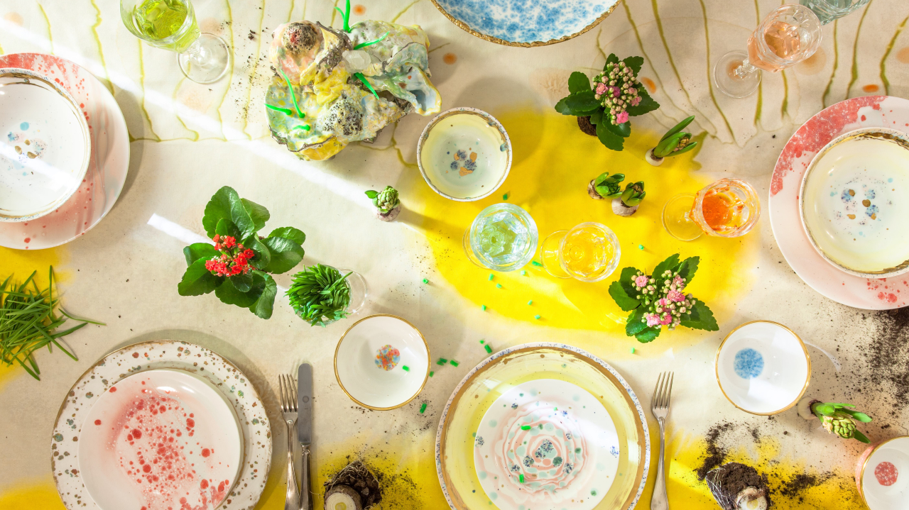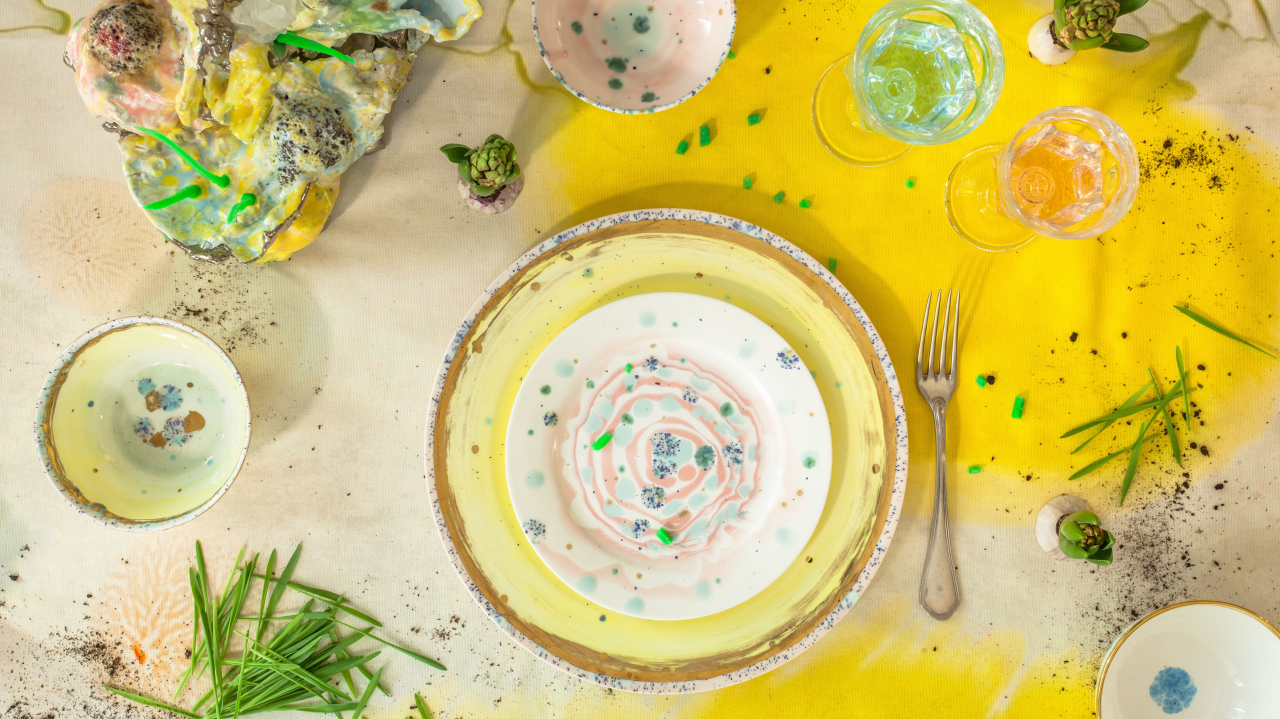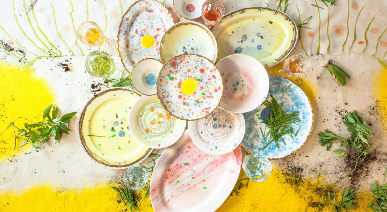 Sono piatti di diversi servizi: insieme sono giocosi, in alcuni nel centro il dot primordiale, in altri semi e pollini si inseguono dentro una spirale. Gli strumenti continuano ad accordarsi, si vede che un coniglio è passato di corsa sul tavolo perché ha sparpagliato terra qua e là. Un cucciolo abbaia e i vasetti di narcisi si sono spogliati e mettono all’aria il loro bellissimo groviglio di radici chiare. Si mangerà sicuramente cicoria ripassata, fave e ricotta di capra.