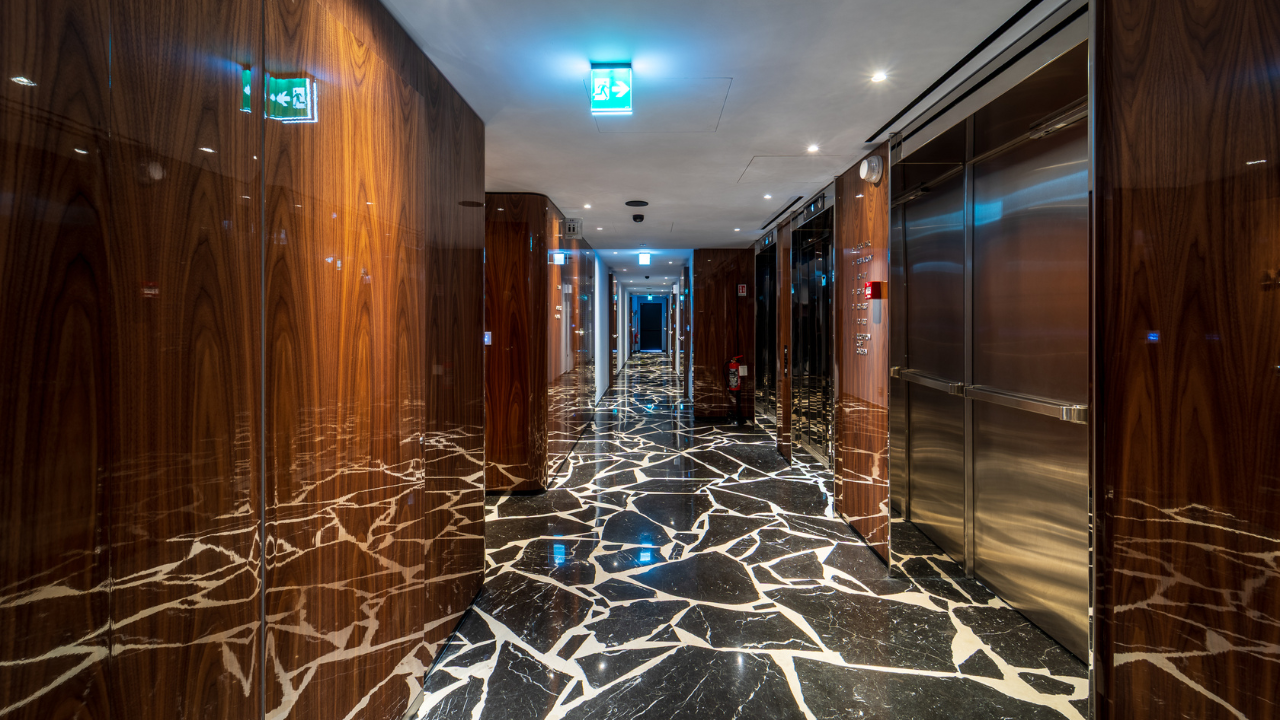 La facciata si inserisce armoniosamente nel contesto storico del quartiere di Porta Venezia e l’architettura dell’hotel è stata curata dal designer Alex Meitlis, noto per il suo stile distintivo che fonde elementi di design contemporaneo con influenze artistiche e culturali; sobria, geometrica, sofisticata, mira ad integrarsi con l’architettura storica, pur distinguendosi per il suo carattere contemporaneo. Le ampie finestre, scandite da una griglia simmetrica, modulano la luce naturale e creano giochi di chiaroscuro che cambiano con il passare delle ore. L’effetto complessivo è vibrante: una pelle architettonica essenziale, pensata per offrire un impatto visivo coerente, discreto e iconico dove anche l’utilizzo di materiali opachi e naturali richiama la filosofia del brand Calimala, orientata alla qualità percettiva e alla valorizzazione del contesto urbano.