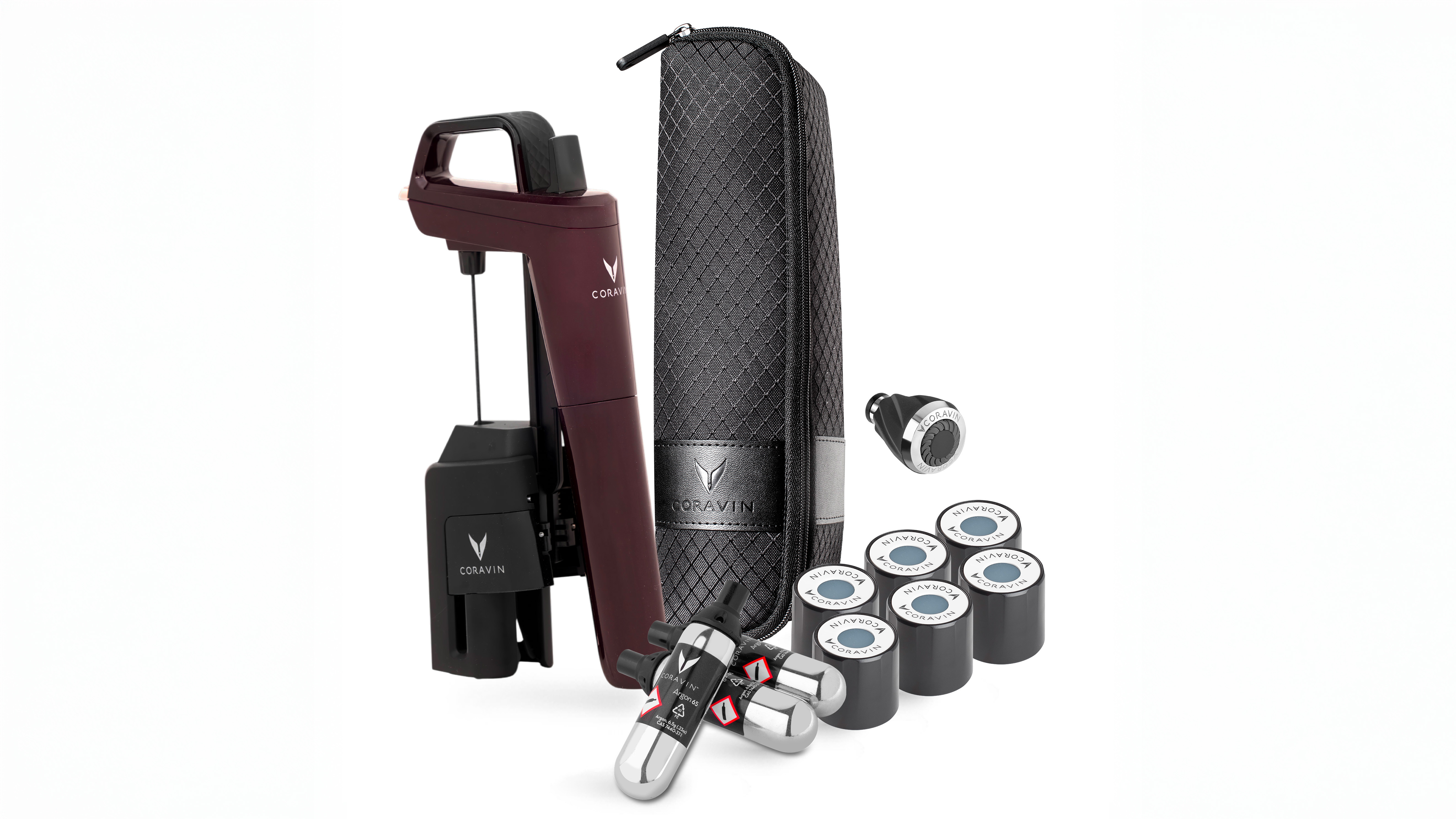 All’interno delle confezioni del Timeless Six+ in Hermitage Red è possibile trovare, oltre al dispositivo, 3 capsule di Argon Coravin Pure®, 6 Tappi a vite Coravin, un Aeratore Premium Timeless – accessorio che aera rapidamente il vino durante la mescita garantendo gli stessi risultati di aromaticità, omogeneità e morbidezza di una decantazione di 60-90 minuti – una custodia da trasporto e una protezione per le bottiglie.