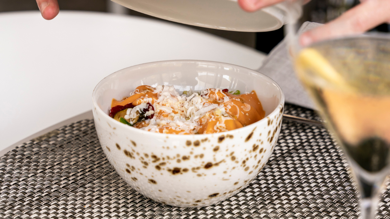 La sezione “Classici” rende omaggio a quei piatti intramontabili che non passano mai di moda, ma qui vengono eseguiti con una precisione da alta cucina. La steak tartare selezionata dalla macelleria di fiducia, il vitello tonnato dalla cottura perfetta e il cuore rosato, accompagnato da una salsa tonnata leggera come una nuvola, la Caesar Salad preparata con pollo ruspante e verdure dell’orto locale, il tortino di riso nero e gamberi che gioca sui contrasti di colore e sapore.
