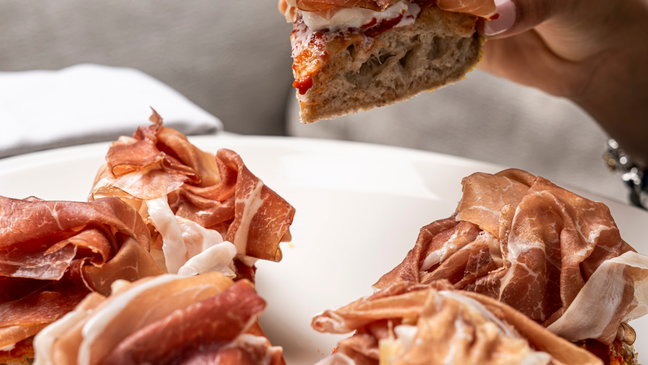La sorpresa arriva anche dalla pizza, che qui non è un semplice comfort food, bensì il risultato di una lievitazione di 72 ore che trasforma un impasto nato nel laboratorio di pasticceria in una base incredibilmente leggera e digeribile. La versione “All’italiana” celebra i sapori del Belpaese con pomodoro San Marzano, pomodori confit, burrata cremosa e basilico fresco, mentre la “Crudo di Parma e burrata” diventa il preludio perfetto per l’aperitivo o lo snack ideale per chi cerca qualcosa di sfizioso senza rinunciare alla qualità. Nelle sale della Pasticceria Roberto il tempo acquista una dimensione diversa. I tavoli illuminati dalla luce naturale che filtra dalle ampie vetrate, diventano piccoli rifugi dove gustare ogni boccone con calma. I colori caldi delle pareti, gli elementi materici come il legno e la pietra creano un ambiente che sa essere elegante senza mai risultare formale. Un luogo dove si sta bene, dove tornare per dedicarsi una coccola.