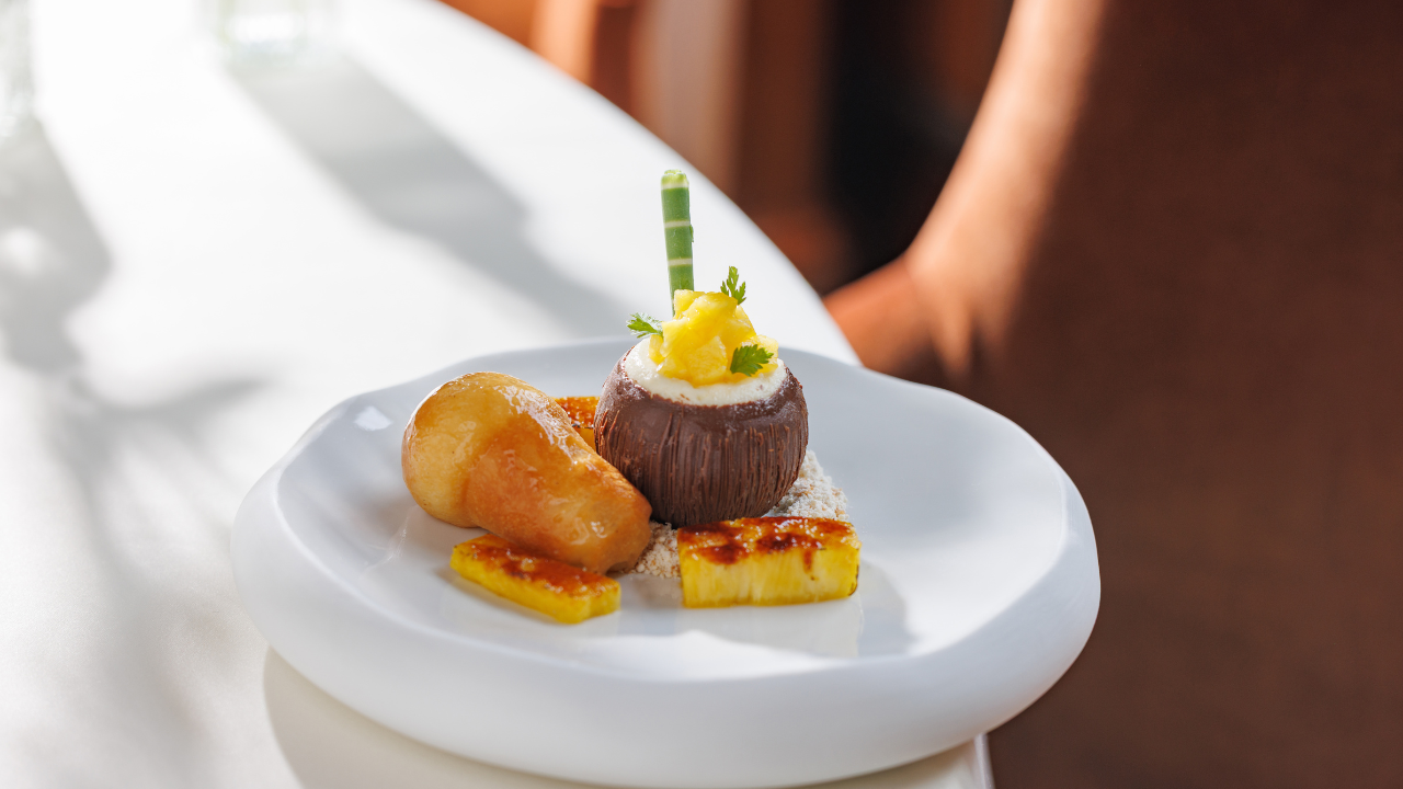 Noce di cocco con babà al rum bianco e ananas caramellato